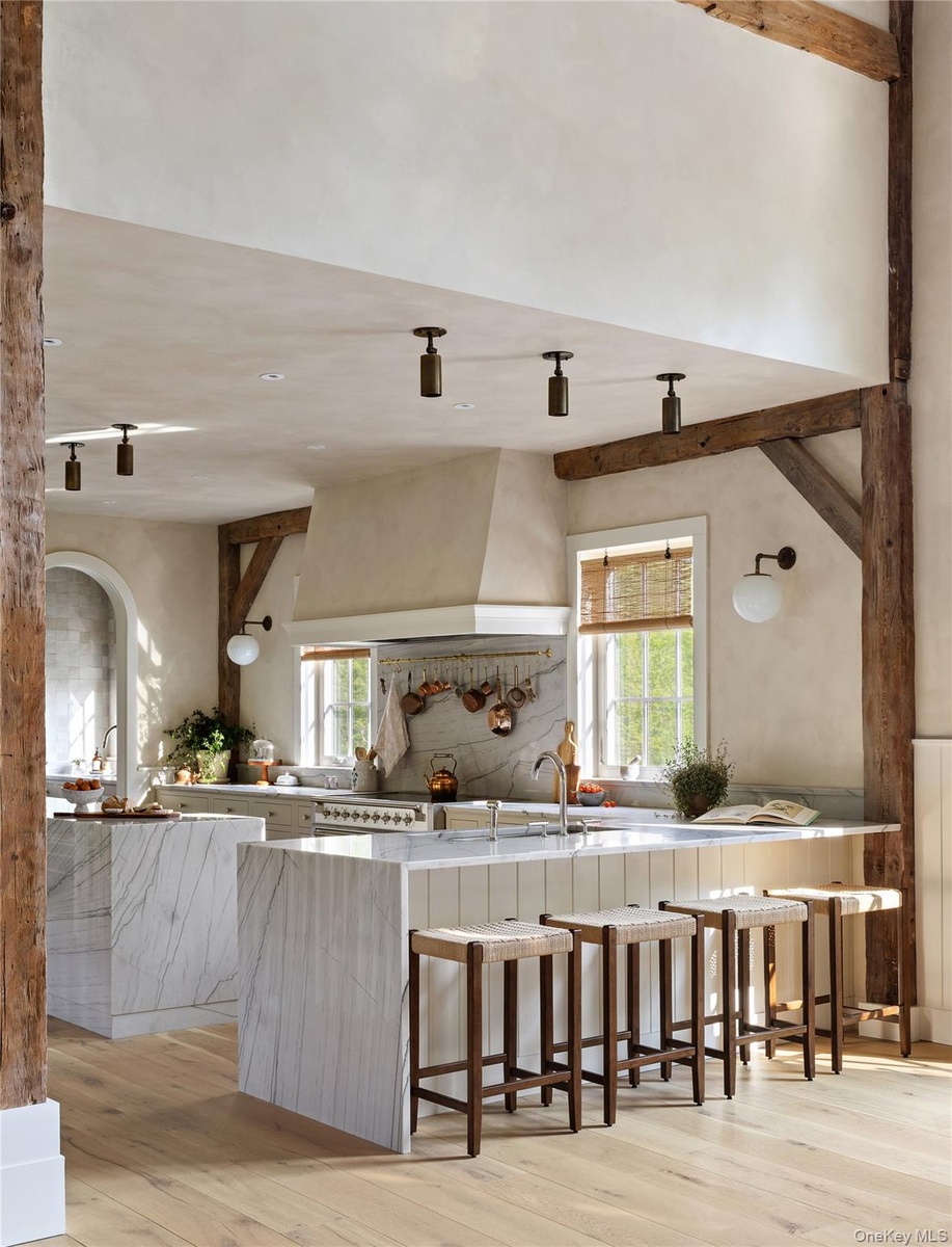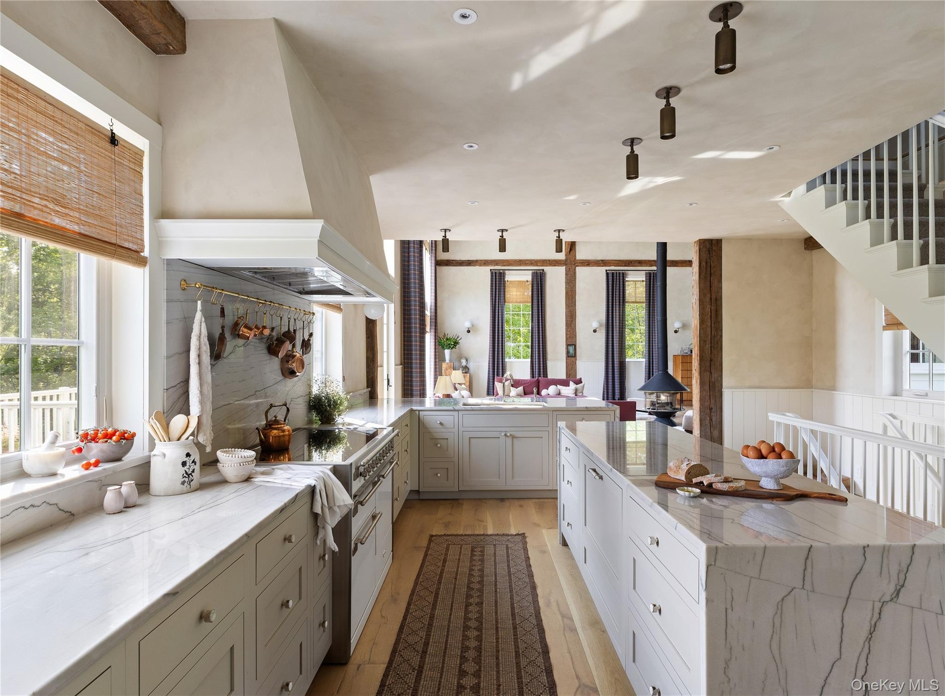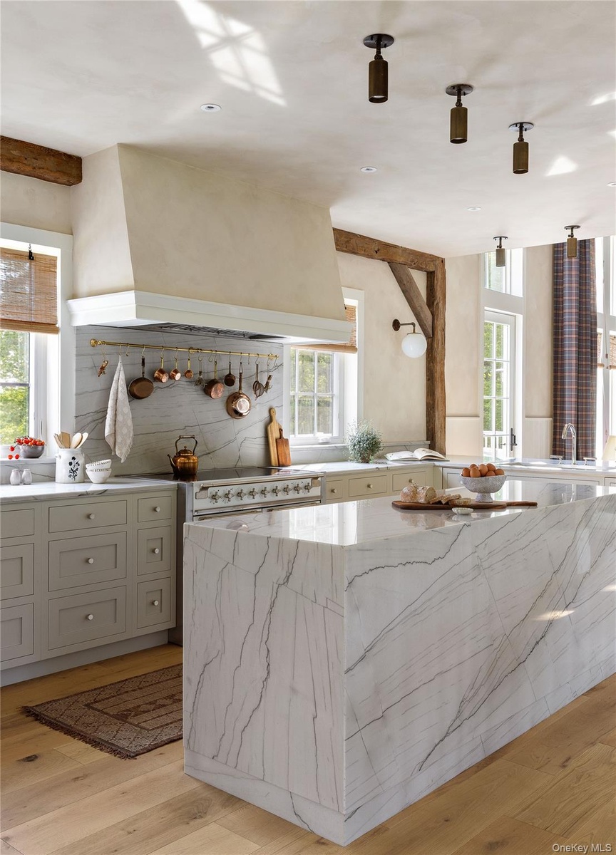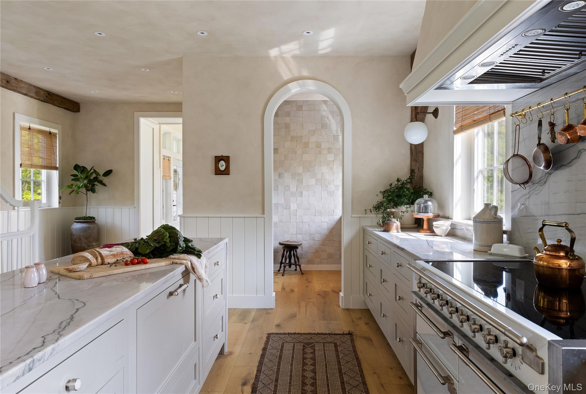 - Kitchen with light wood finished floors, light stone countertops, and healthy amount of natural light