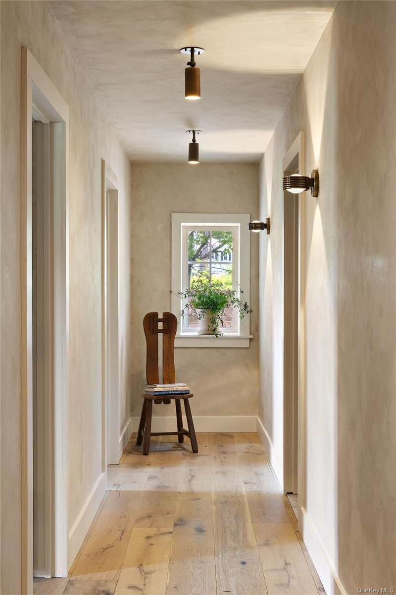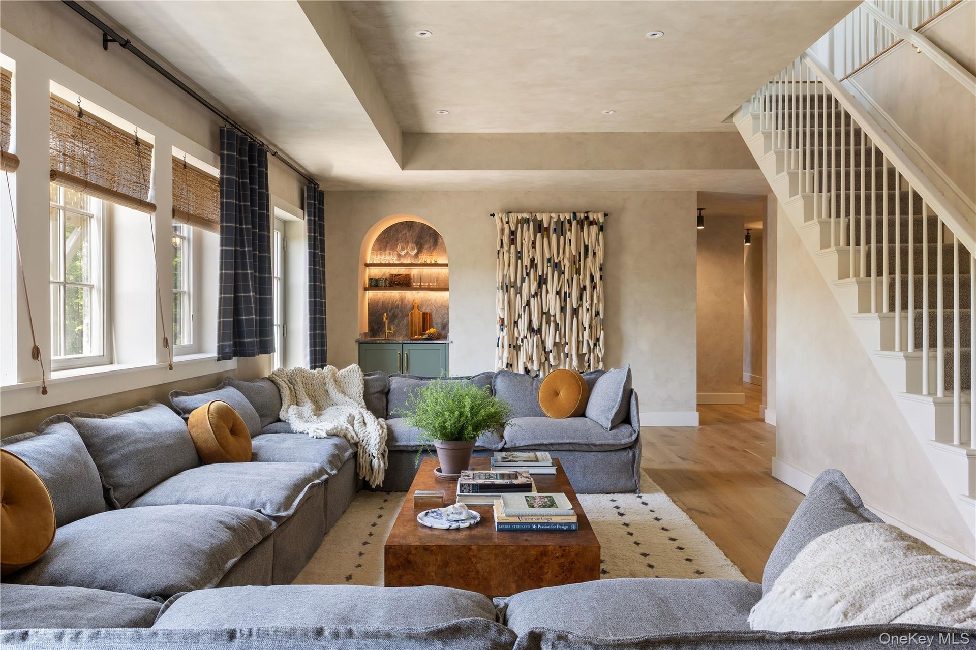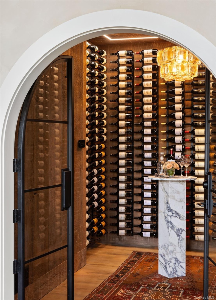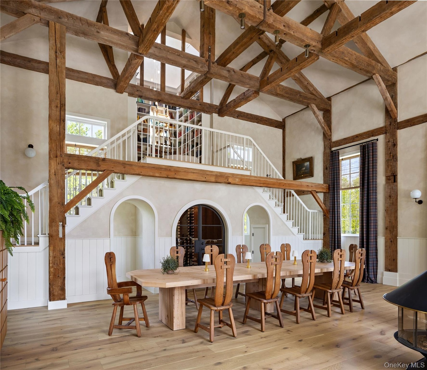 Ascending a symmetrical dual staircase, the Great Room opens into a dramatic library loft housed within the home’s original church cupola, crowned by an 18-foot long, multi-point glass chandelier and custom floor-to-ceiling bookcases. Just off the dining area, a glass-fronted, 625-bottle refrigerated wine room is enclosed by custom arched iron doors. The home offers five bedrooms and four-and-a-half exquisitely finished baths, each appointed with radiant heat, curated tilework, and an artful mix of stone and marble. The secluded primary suite occupies its own private wing and includes a spa-like bath with soaking tub, dual showers, Bardiglio marble, and double vanities framed by custom glass partitions. The walkout lower level features a secondary living room with wet bar, two guest quarters, built-in bunk room, and a spacious laundry suite with double washers and dryers. Lime-washed walls, wide-plank white oak flooring, and bespoke lighting carry a sense of quiet luxury throughout.