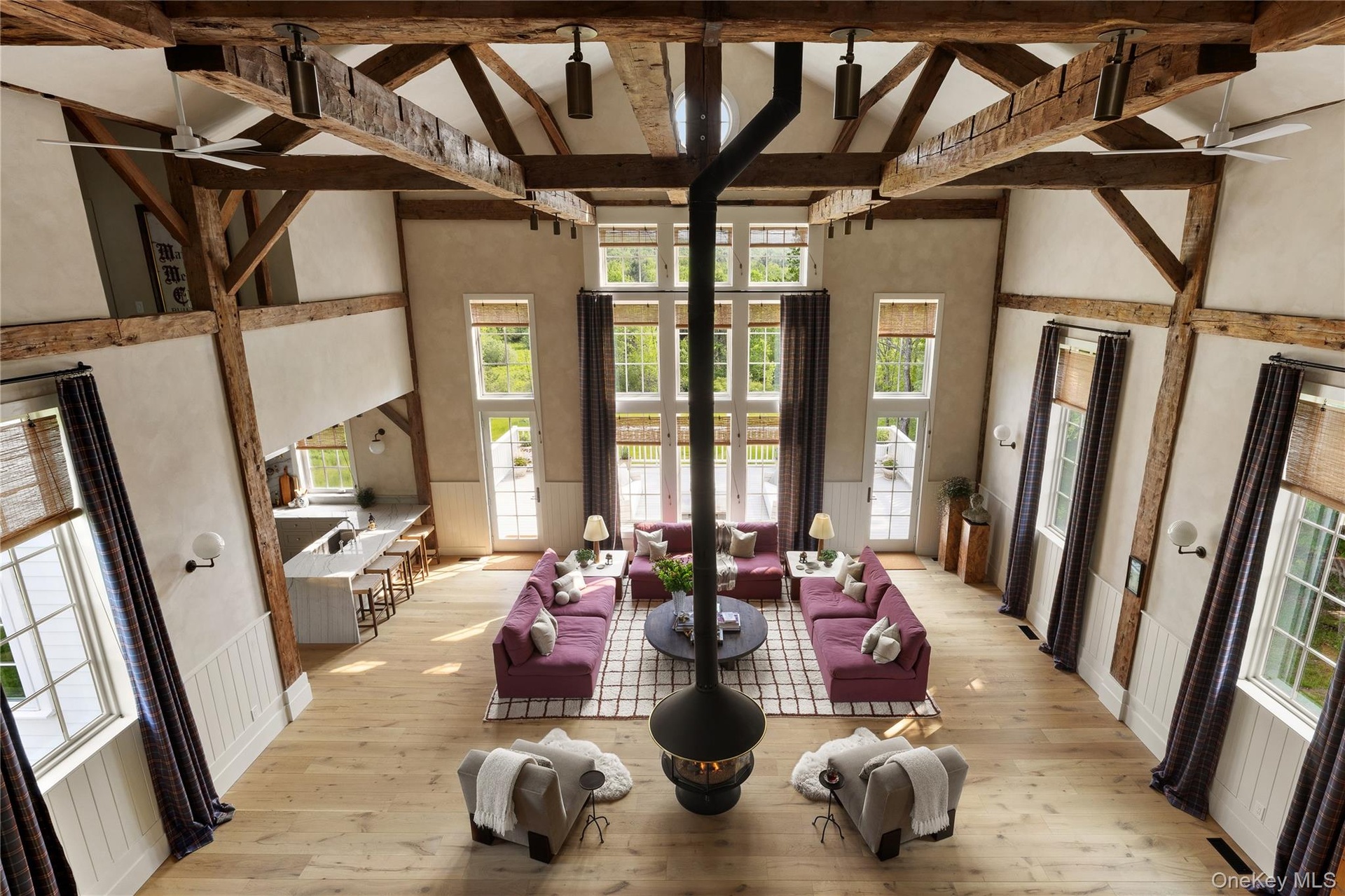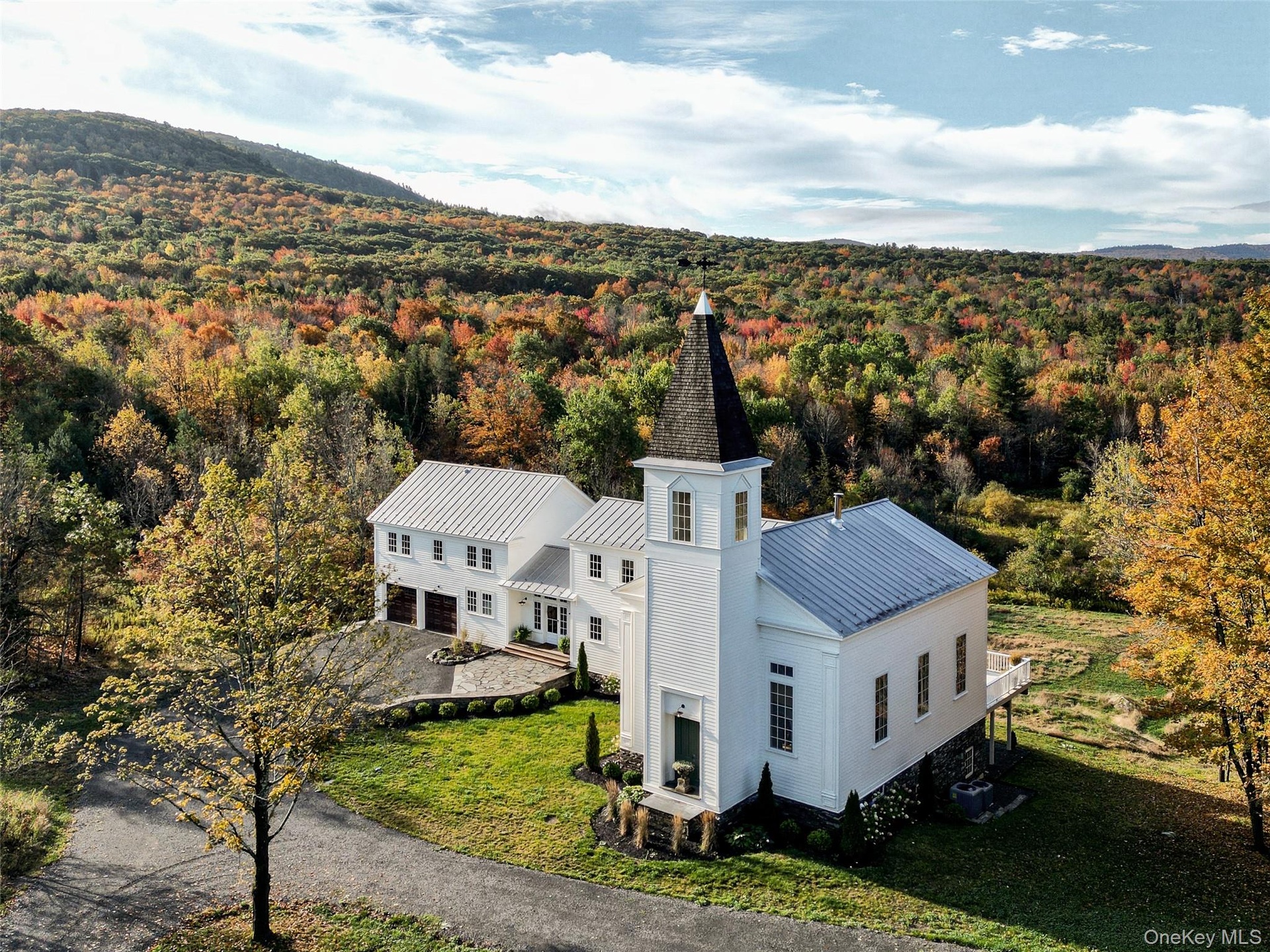 Welcome to Potter Mountain House, a masterfully reimagined Greek Revival church turned luxury designer estate. The original timber-framed structure was constructed in 1837 as the Manorkill Methodist Church, serving its community for over a century before being carefully dismantled and relocated to its current site in Gilboa, NY. Now sited on 37 acres with sweeping Catskill Mountain views, the building began its two-year transformation in 2023 by the boutique design/build firm ICDT Studio into a breathtaking 6,242-square-foot residence—honoring its historic soul while layering in a refined, design-forward sensibility. The result is a one-of-a-kind architectural offering that balances reverence for the past with an intentional, contemporary design ethos.