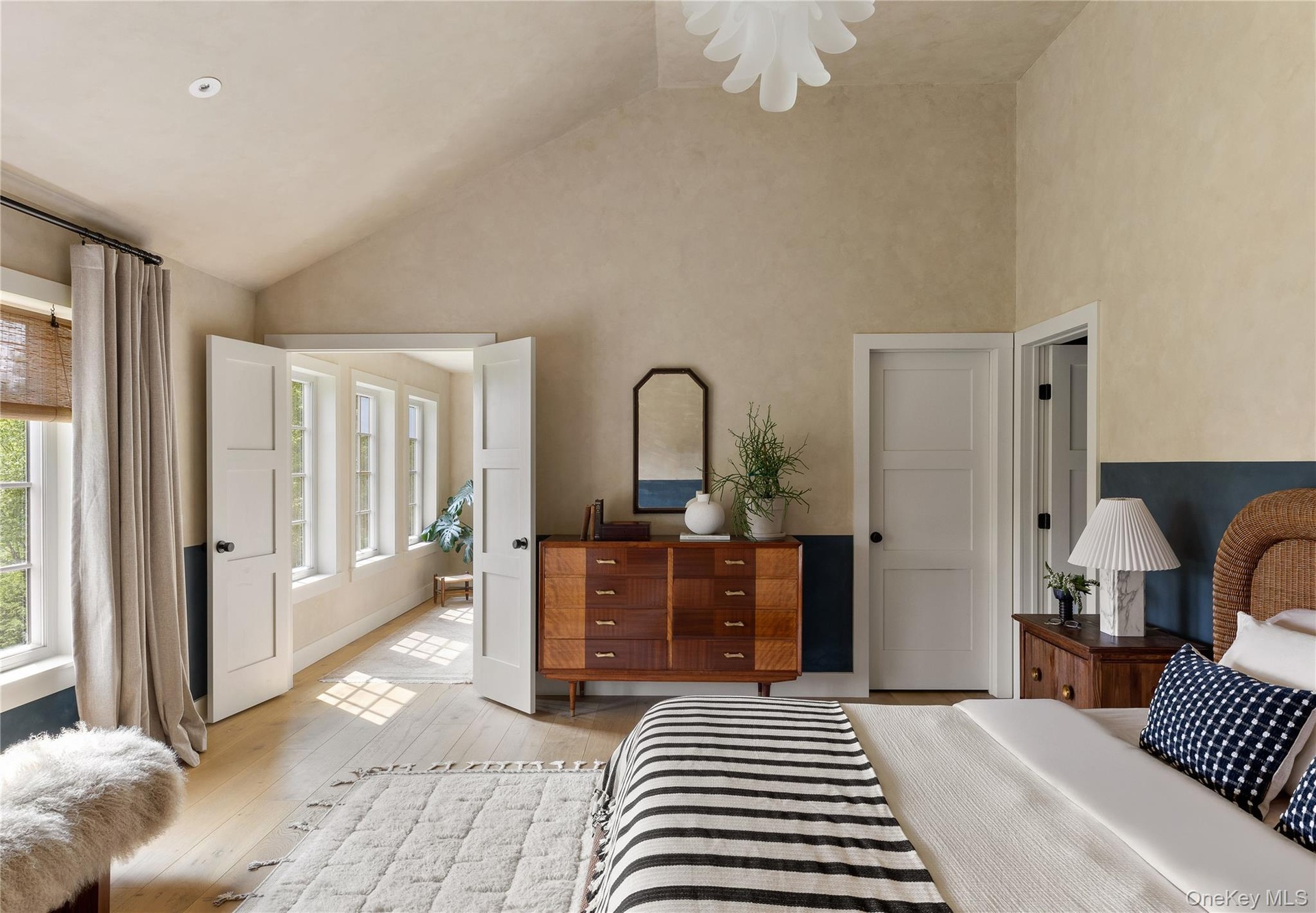 - Bedroom featuring high vaulted ceiling and light wood-type flooring