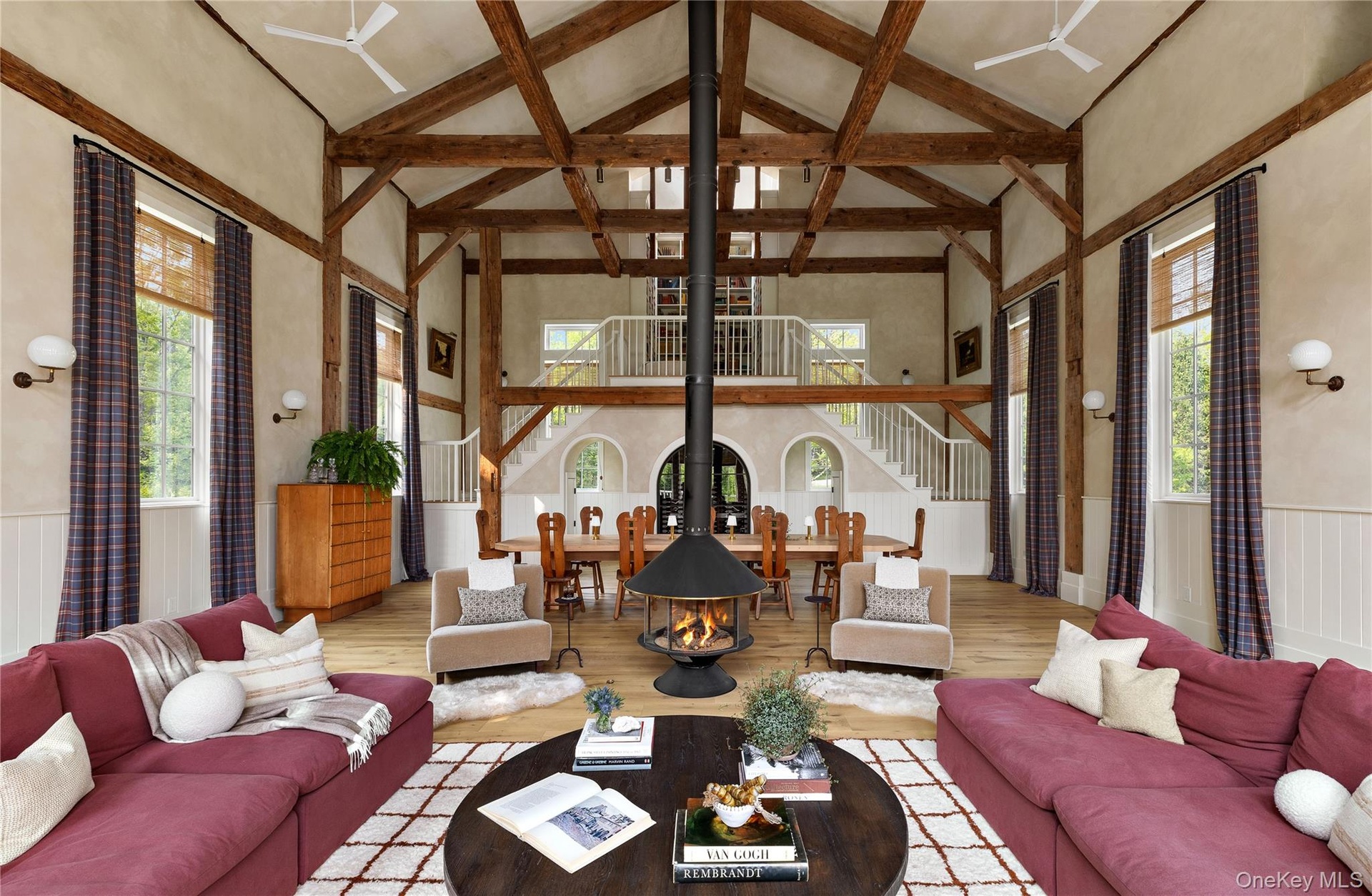 Inside, every detail delivers. The three finished levels are anchored by a soaring Great Room featuring the restored original timber frame, hand-hewn beams, and a full wall of windows that frame the panoramic mountain views. A round, sculptural gas fireplace adds warmth and ambiance between the living and dining spaces, while the chef’s kitchen features a 48” AGA induction range, Fisher & Paykel appliances, Waterworks fixtures, and a stunning stone-clad island. A walk-in pantry accented by reclaimed wood beams and lined with Zellige tile completes the space. The spacious, open layout provides a striking balance of style and function for both daily living and entertaining.