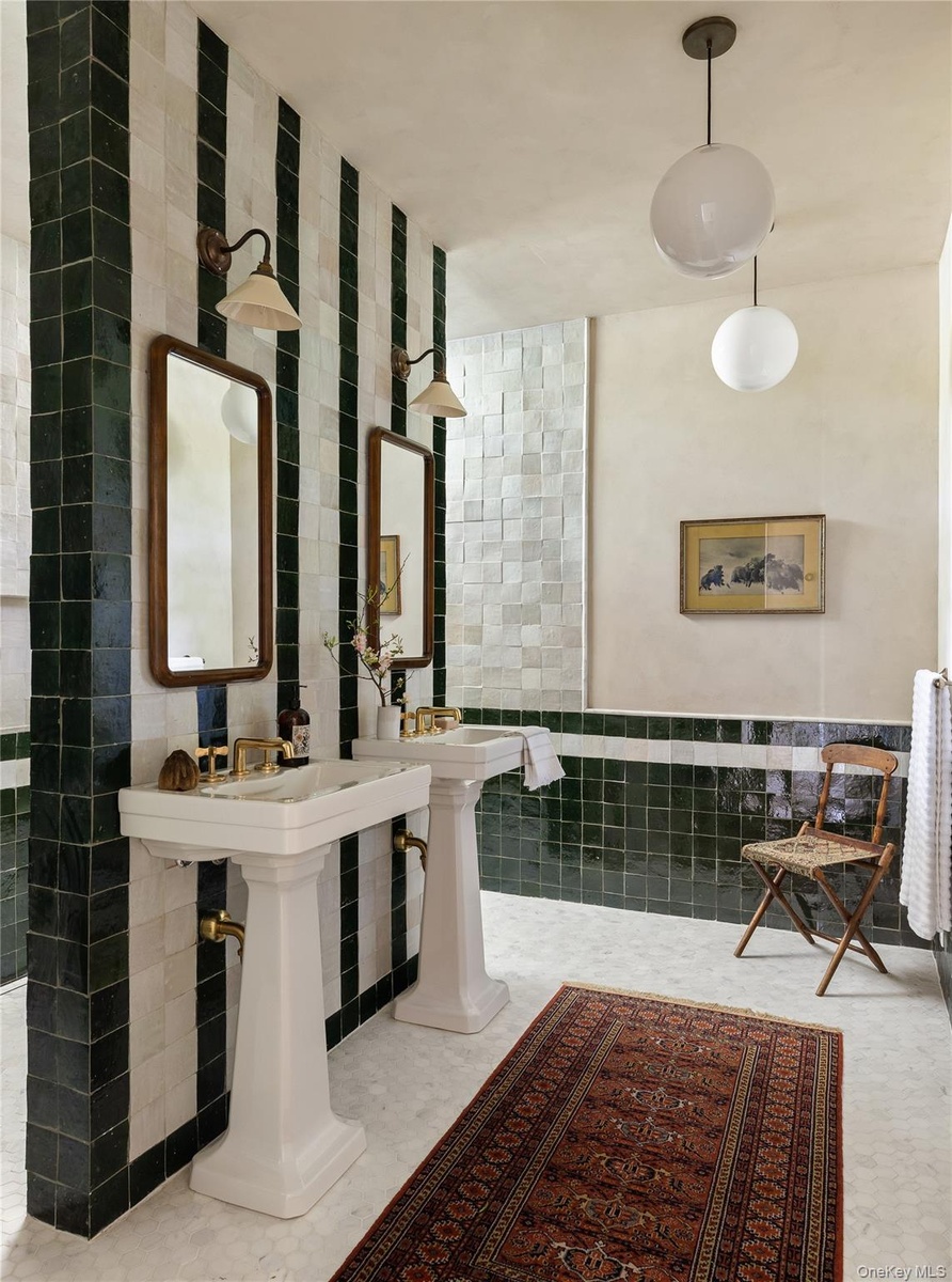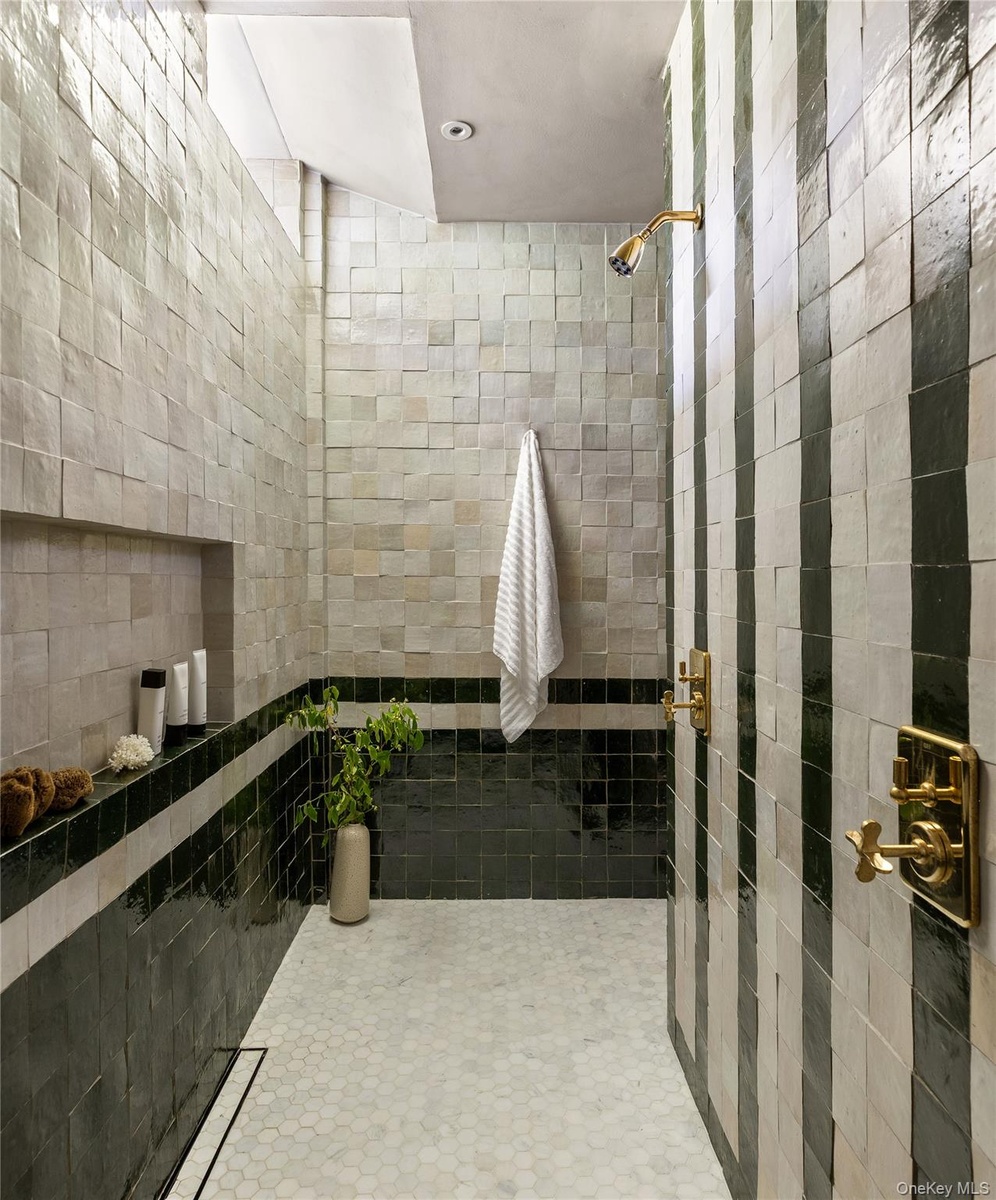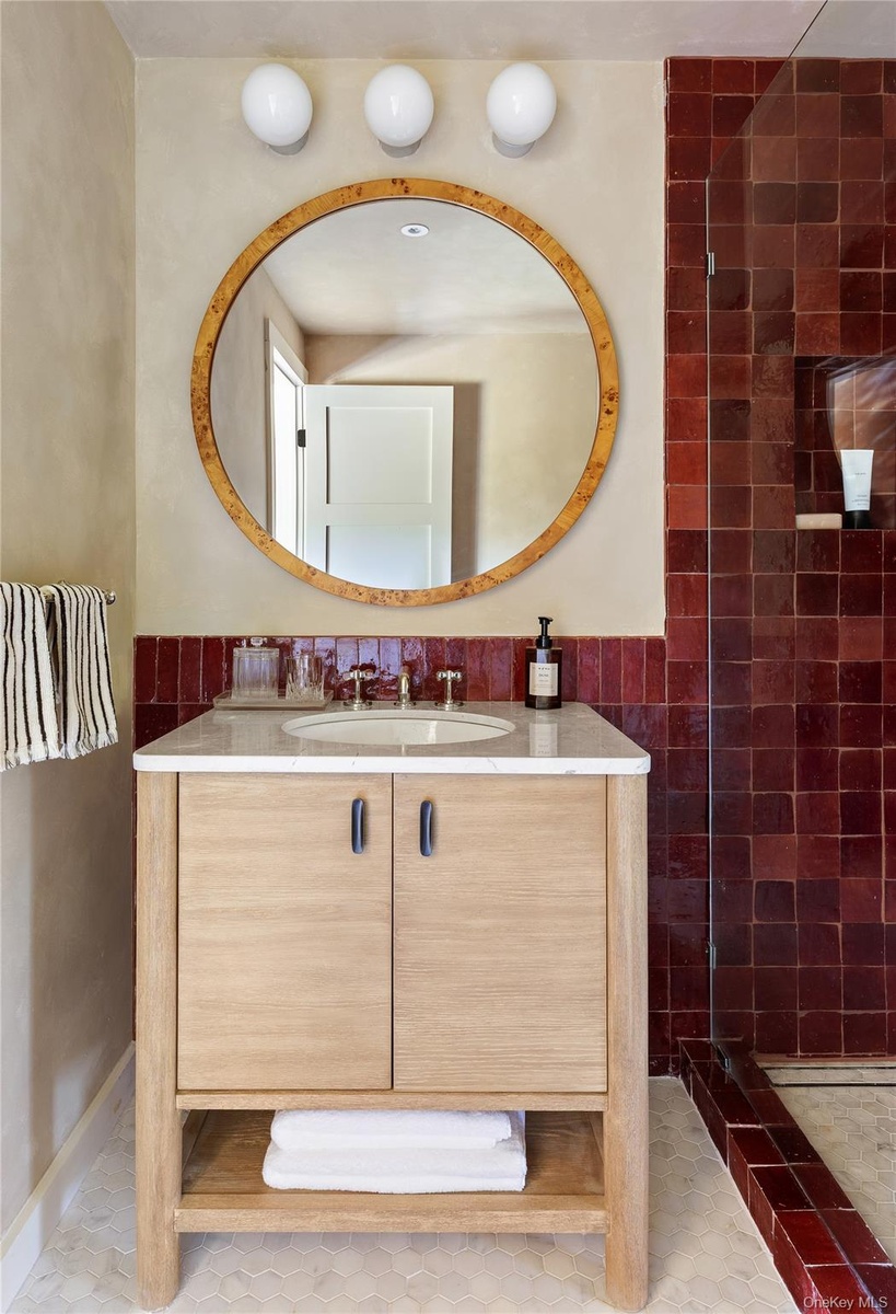 - Full bathroom with vanity, a tile shower, tile walls, and tile patterned flooring