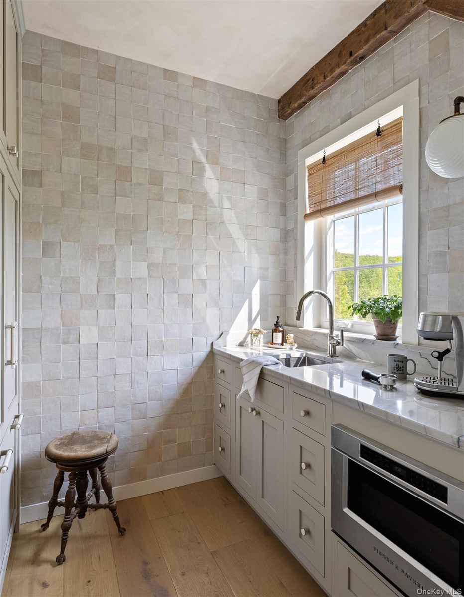 - Kitchen with tile walls, light wood-style floors, and light stone countertops