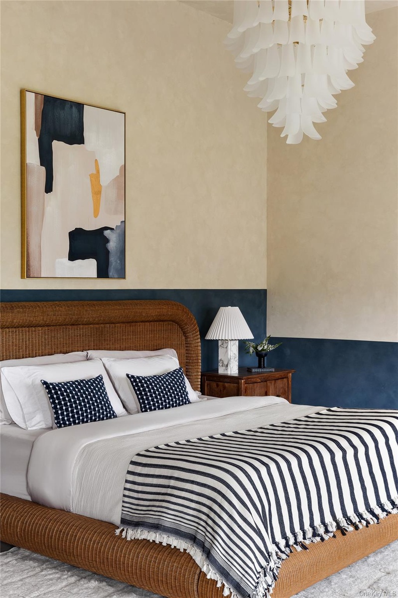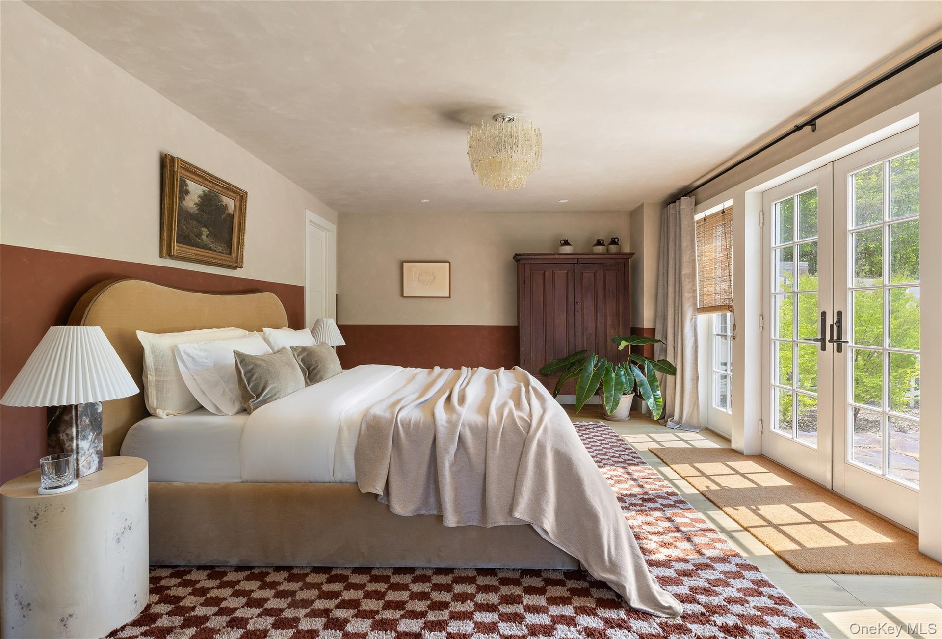 - Bedroom featuring access to outside, hardwood / wood-style flooring, and a chandelier