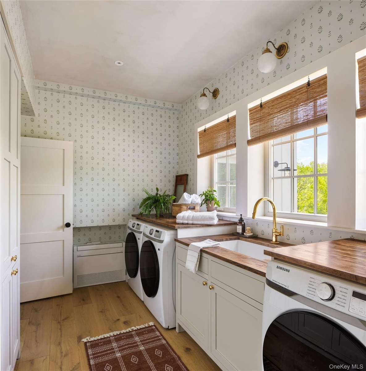 - Laundry area featuring washer and clothes dryer, wallpapered walls, light wood-style flooring, and cabinet space