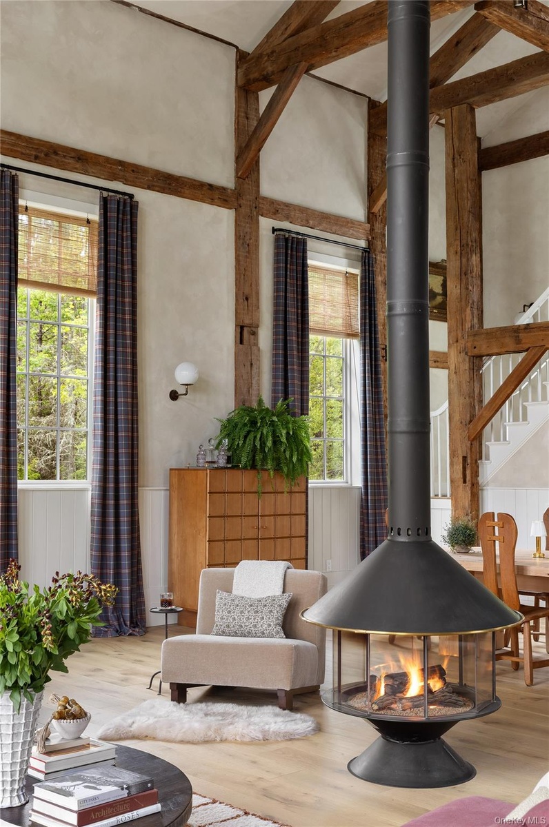 - Living area with a wood stove, a towering ceiling, wainscoting, hardwood / wood-style flooring, and beam ceiling