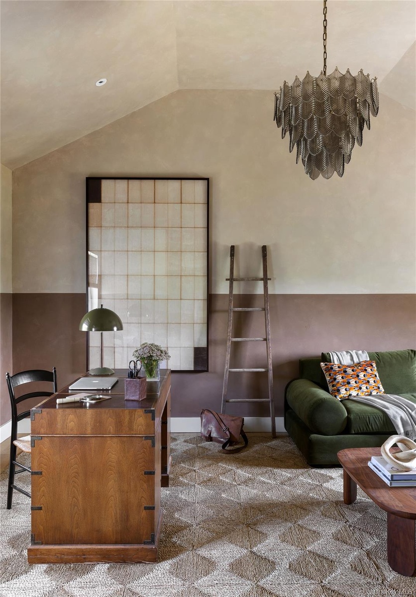 - Living area featuring carpet flooring, vaulted ceiling, and an office area