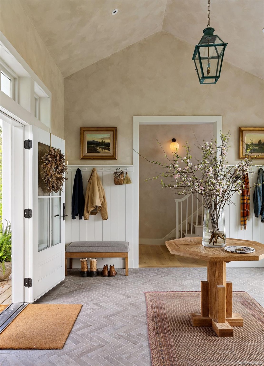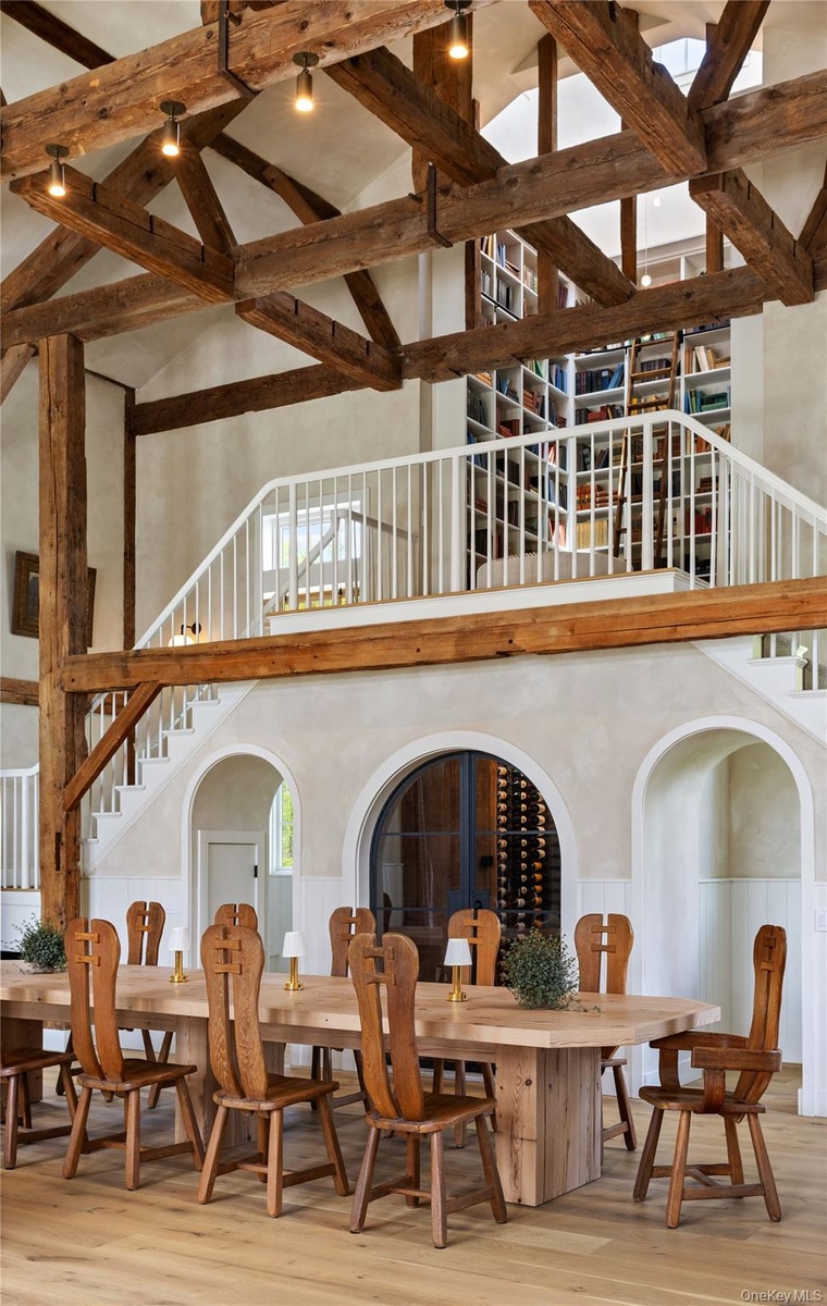 - Dining space featuring high vaulted ceiling, stairway, wood finished floors, a wainscoted wall, and beam ceiling