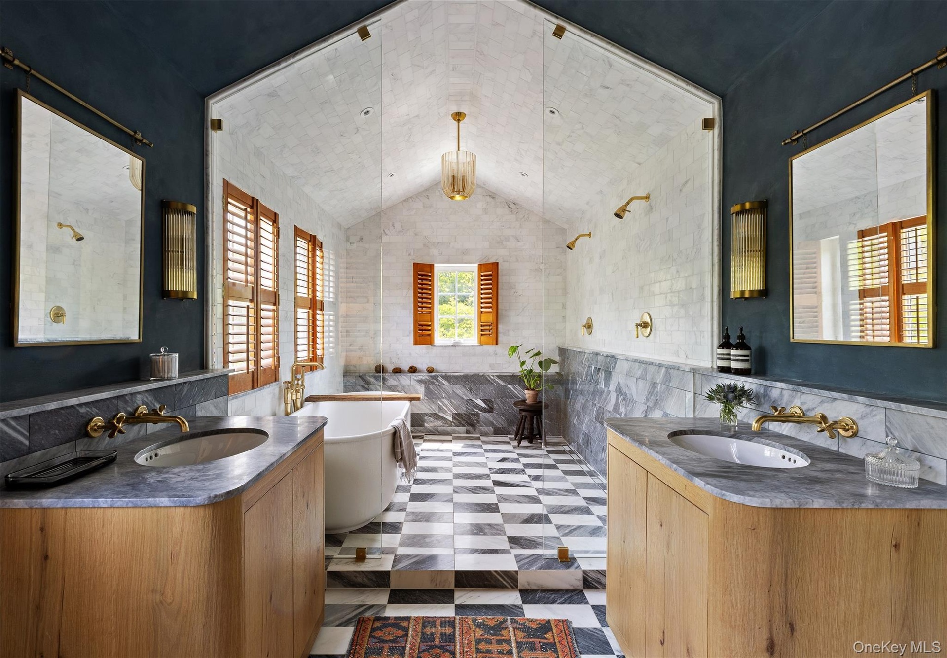 - Bathroom featuring tile walls, a freestanding tub, two vanities, lofted ceiling, and wainscoting