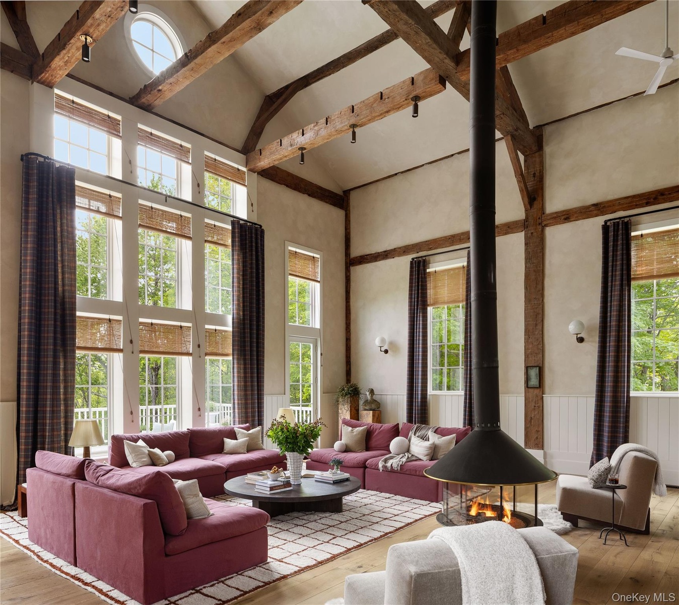 - Living room with healthy amount of natural light, wood finished floors, a wood stove, and high vaulted ceiling