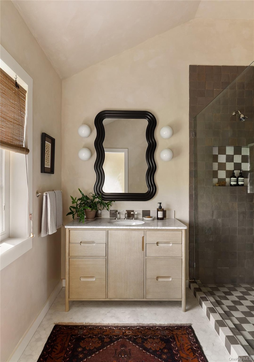 - Bathroom with vaulted ceiling, a tile shower, and vanity