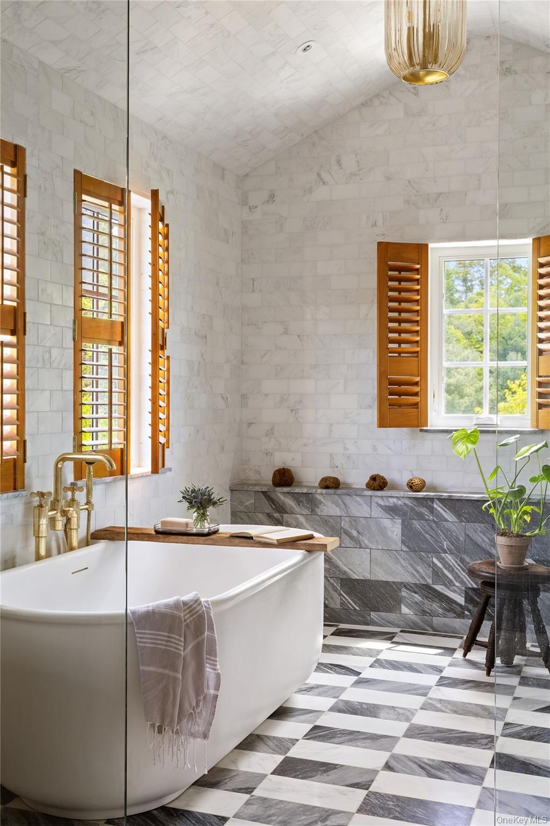 - Full bath with healthy amount of natural light, tile patterned floors, a freestanding bath, and lofted ceiling
