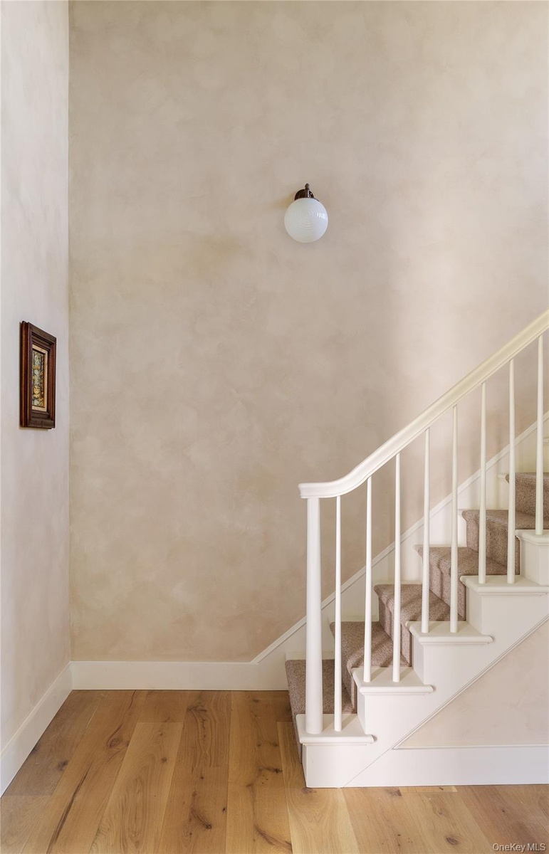 - Living area with wood finished floors, stairway, and a raised ceiling