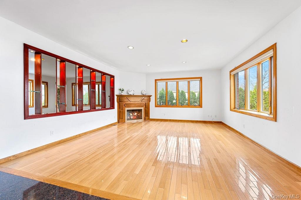 - Living room featuring hardwood / wood-style floors, a fireplace with flush hearth, and recessed lighting