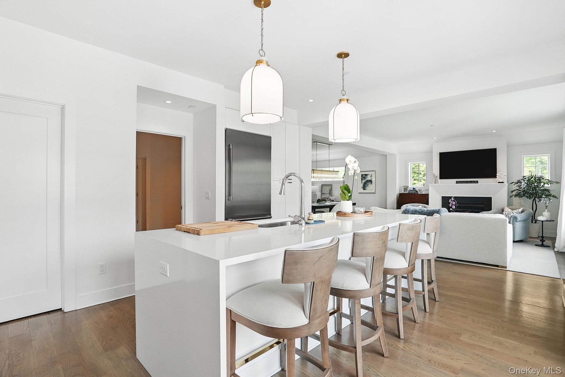 - Kitchen with high end refrigerator, light countertops, white cabinets, a fireplace, and decorative light fixtures