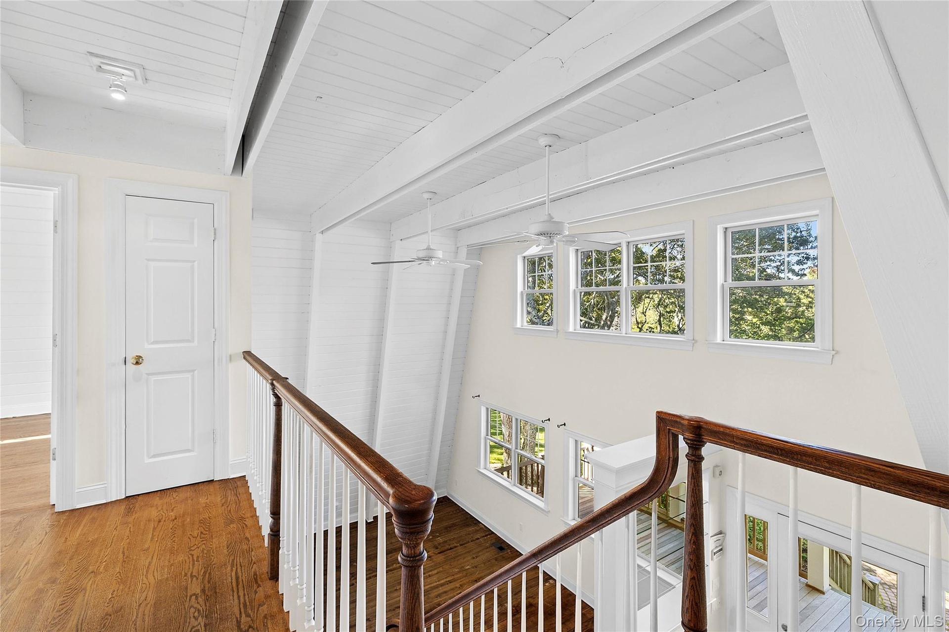 - Corridor with beam ceiling, an upstairs landing, wood finished floors, and plenty of natural light
