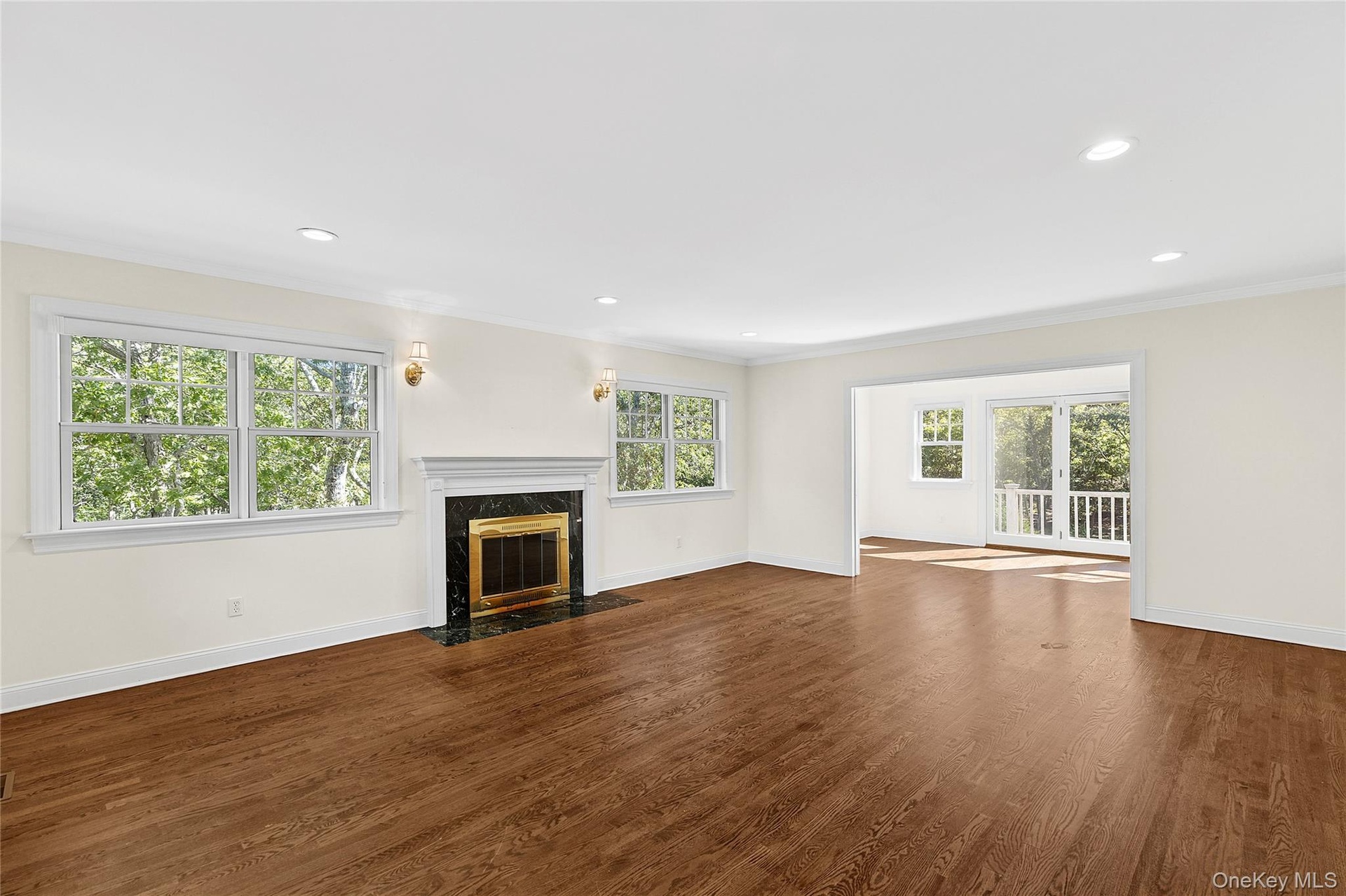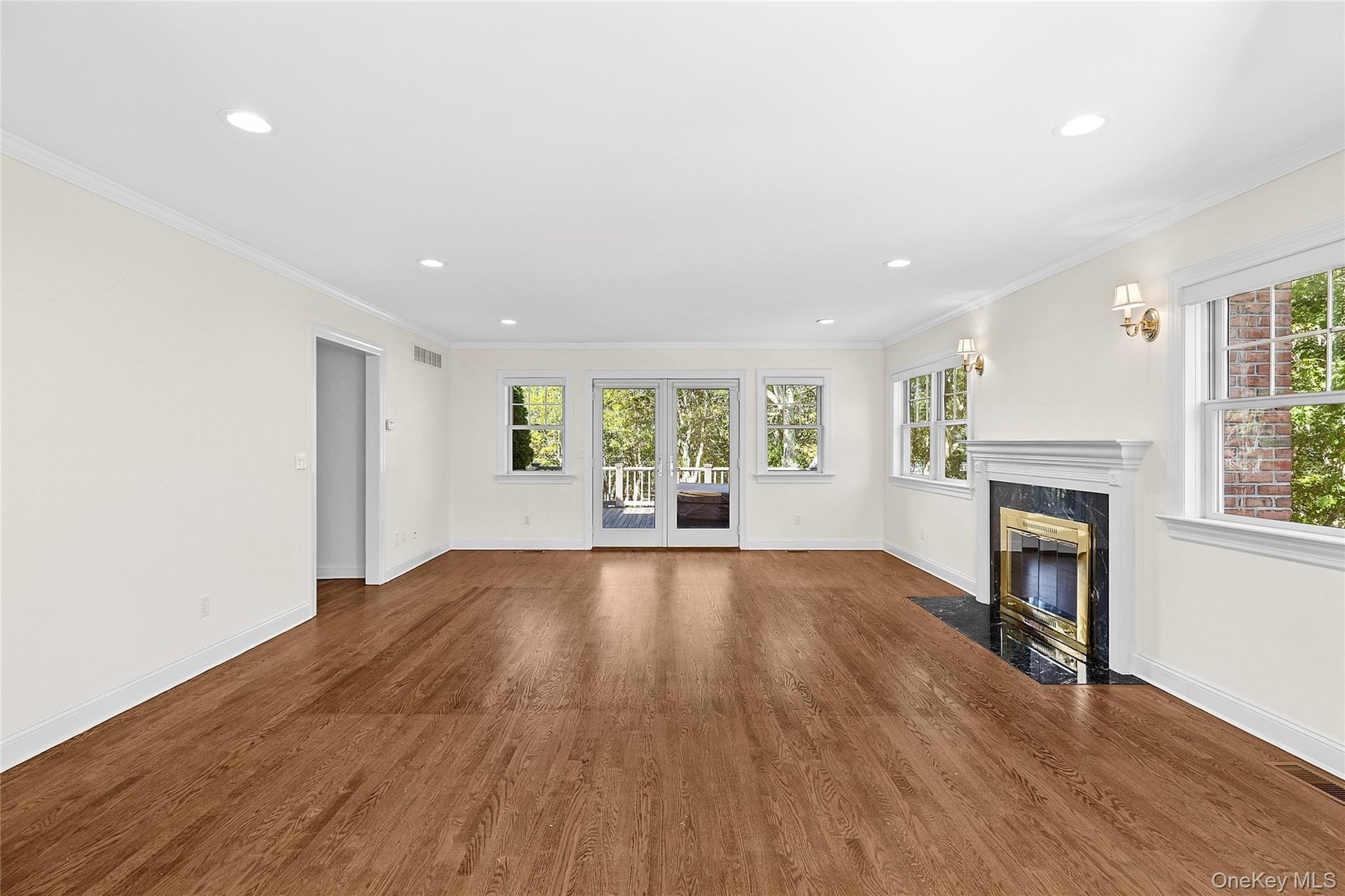 - Unfurnished living room featuring ornamental molding, dark wood-type flooring, healthy amount of natural light, a high end fireplace, and recessed lig