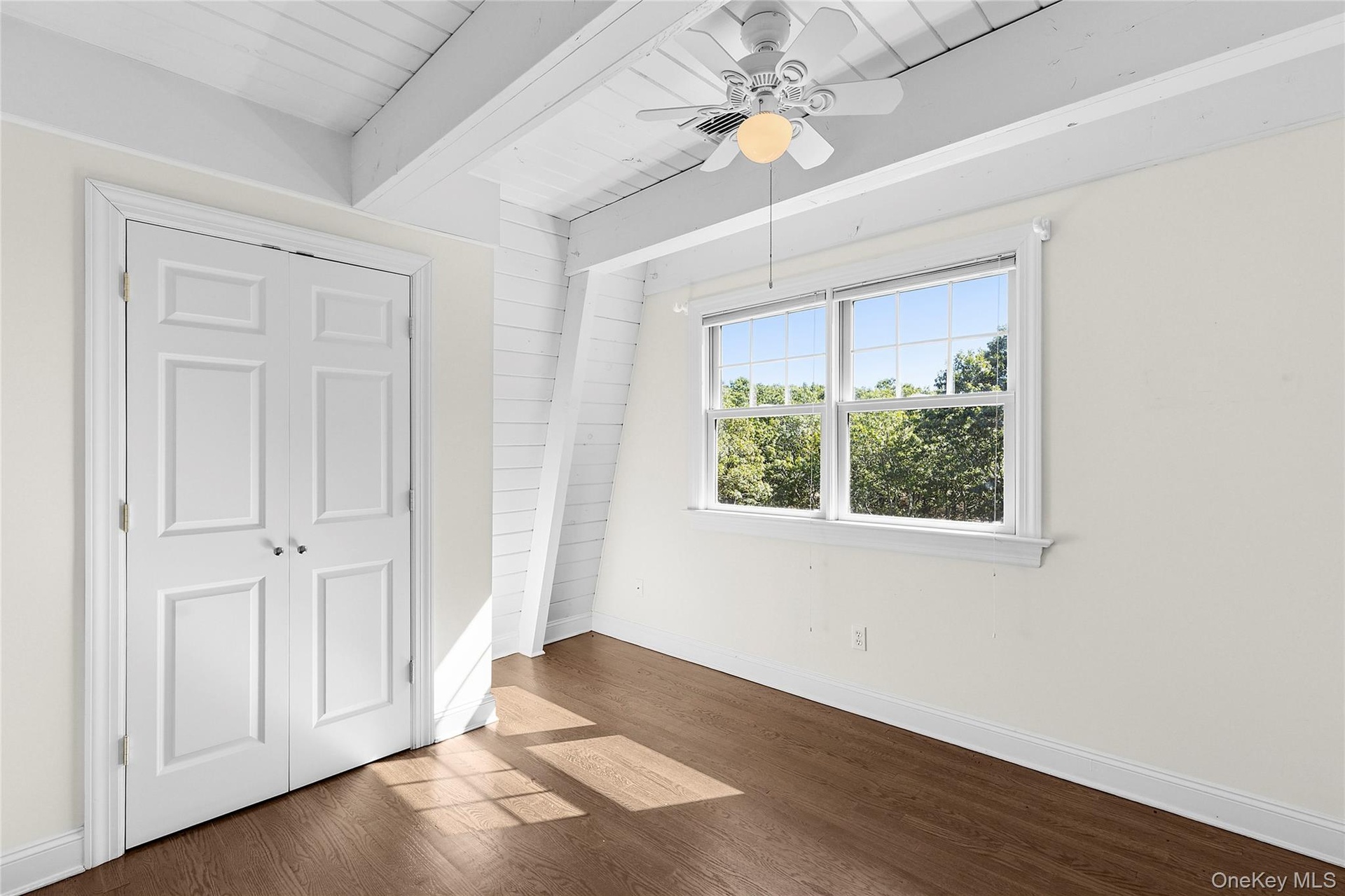 - Unfurnished bedroom featuring wood finished floors, beam ceiling, a ceiling fan, and a closet