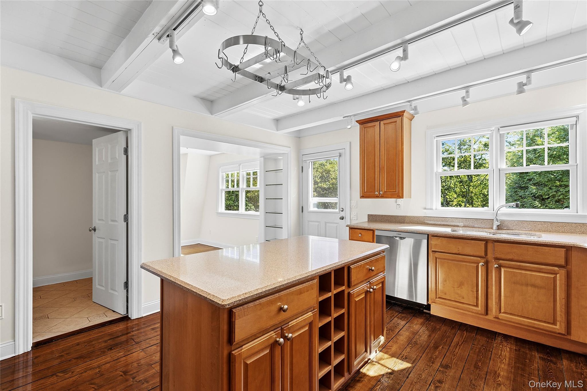 - Kitchen with rail lighting, brown cabinets, a kitchen island, light stone counters, and beamed ceiling