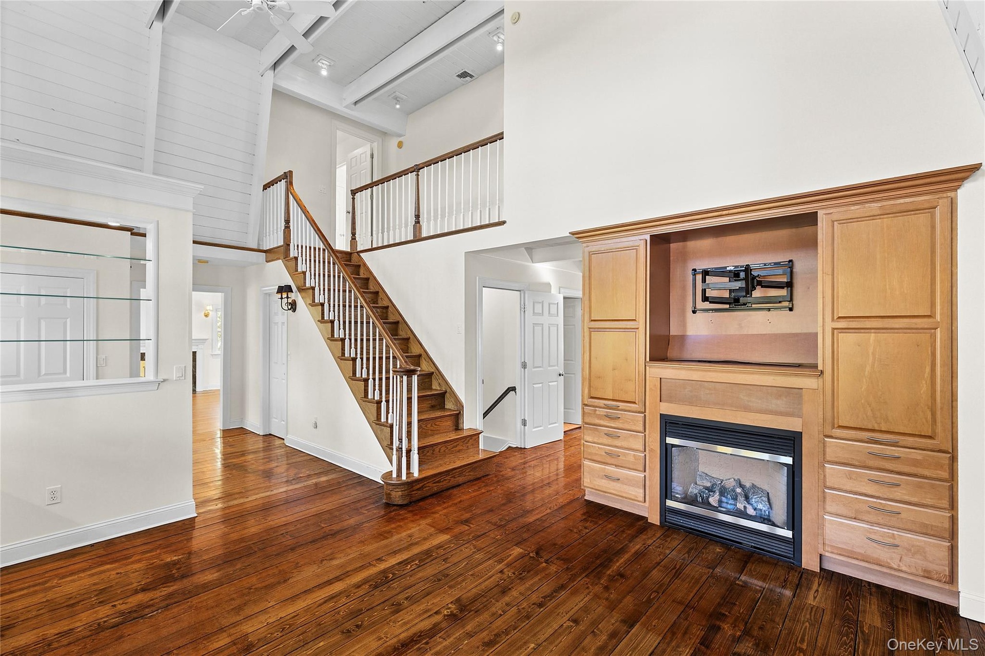 - Unfurnished living room with a towering ceiling, dark wood finished floors, a glass covered fireplace, and stairs