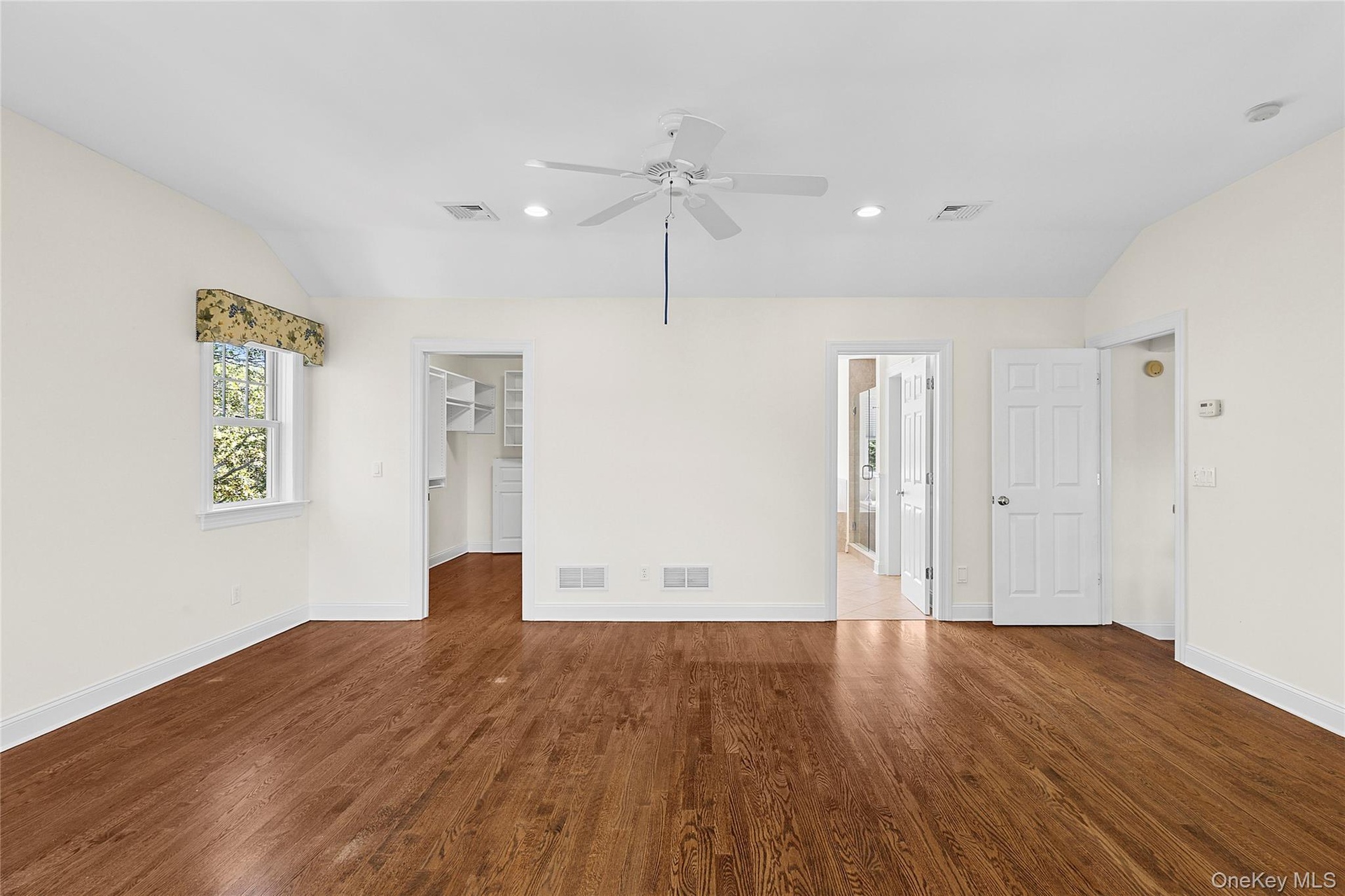 - Unfurnished bedroom featuring vaulted ceiling, a spacious closet, dark wood-style flooring, a ceiling fan, and recessed lighting