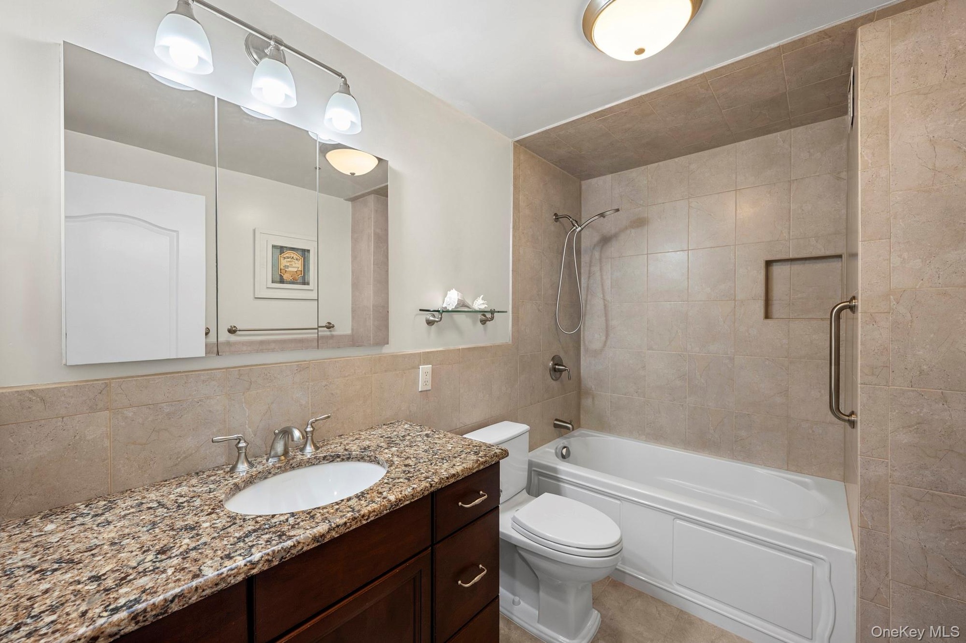 - Bathroom with vanity, shower / bath combination, and tile walls