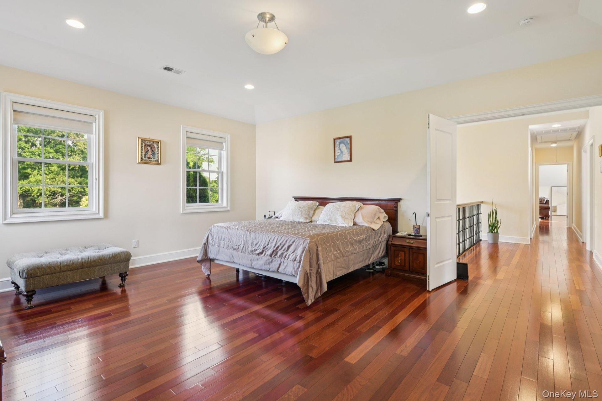 - Bedroom featuring multiple windows, Braziian flooring, and recessed lighting