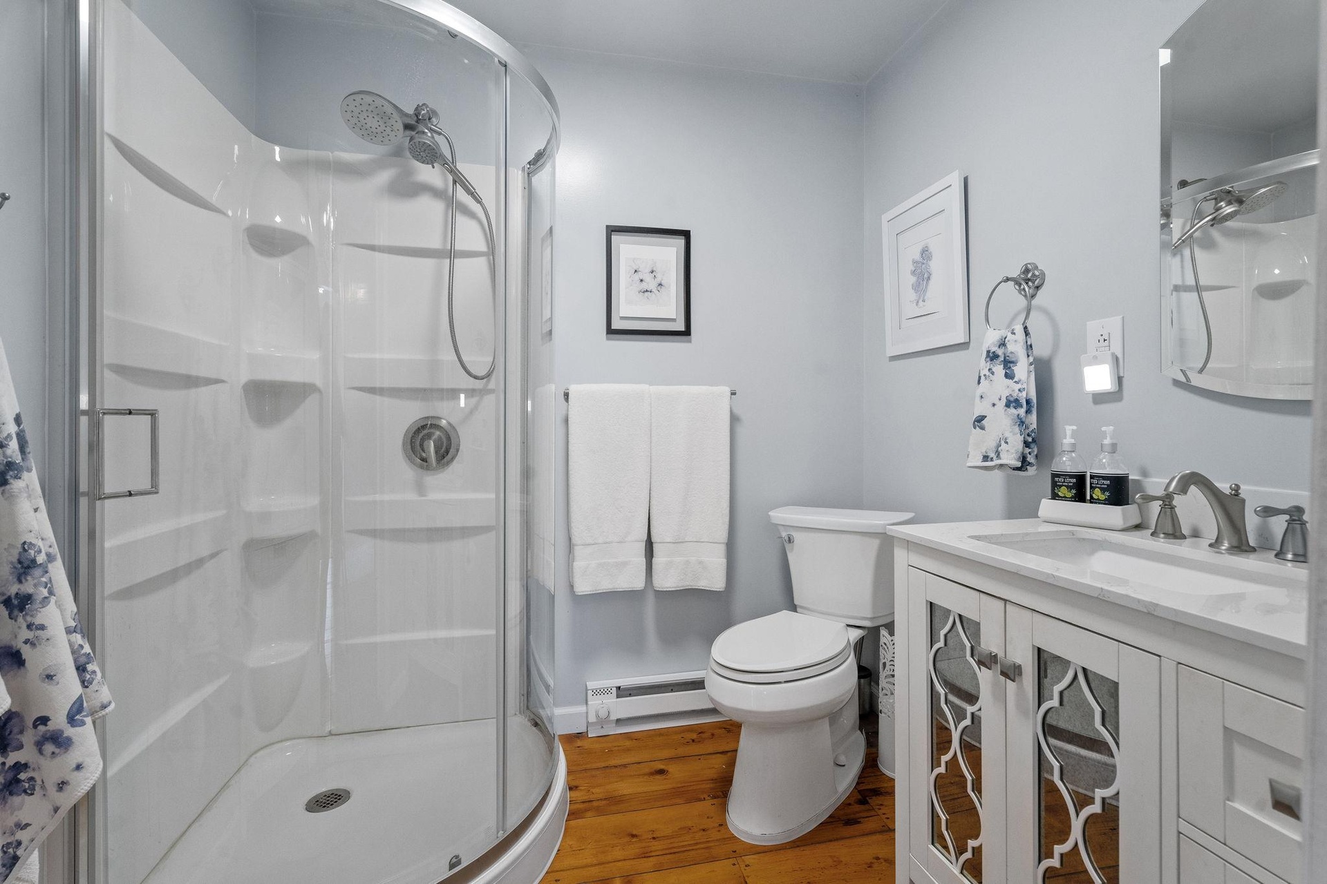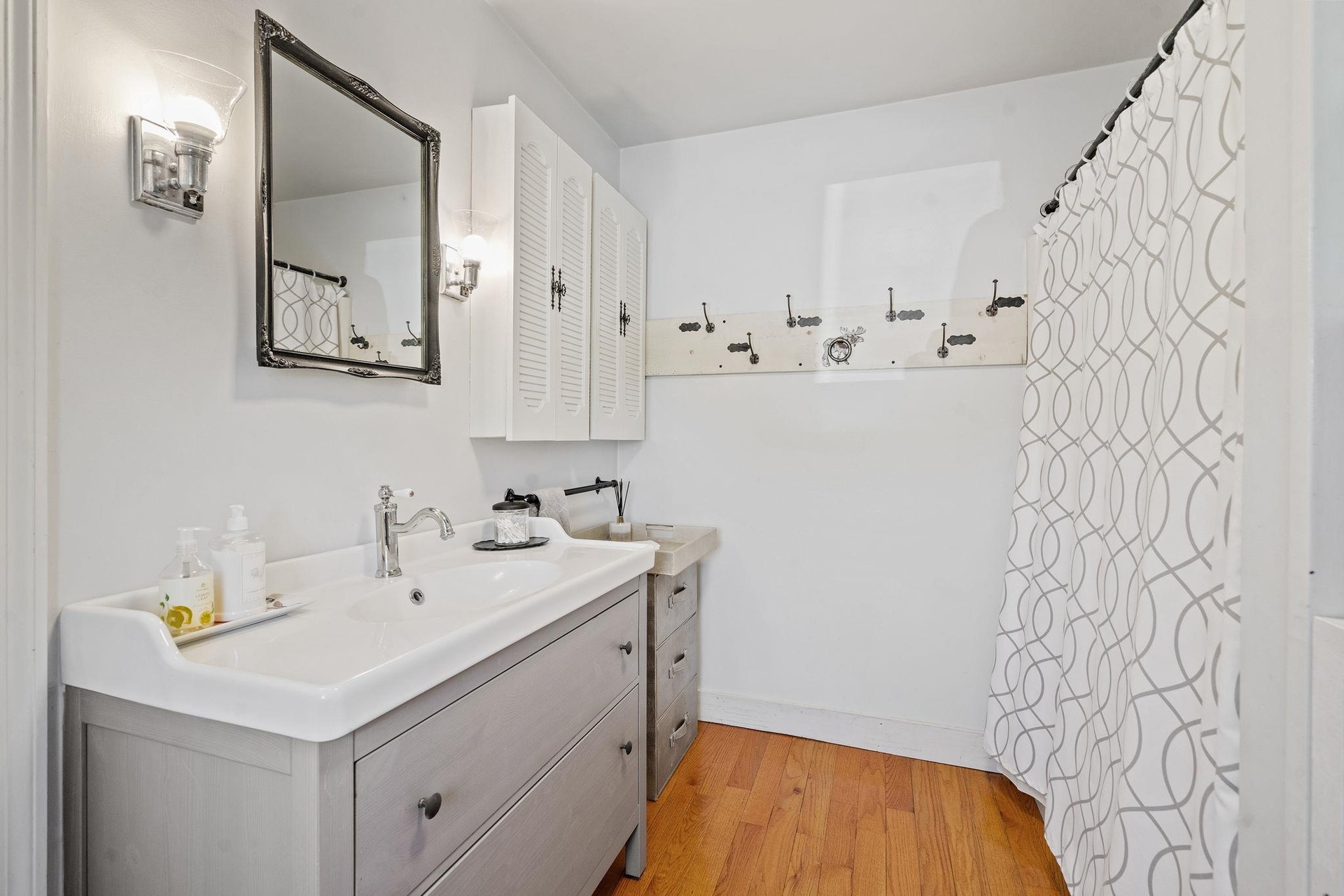 - Bathroom with baseboard heating, a shower stall, wood finished floors, and vanity