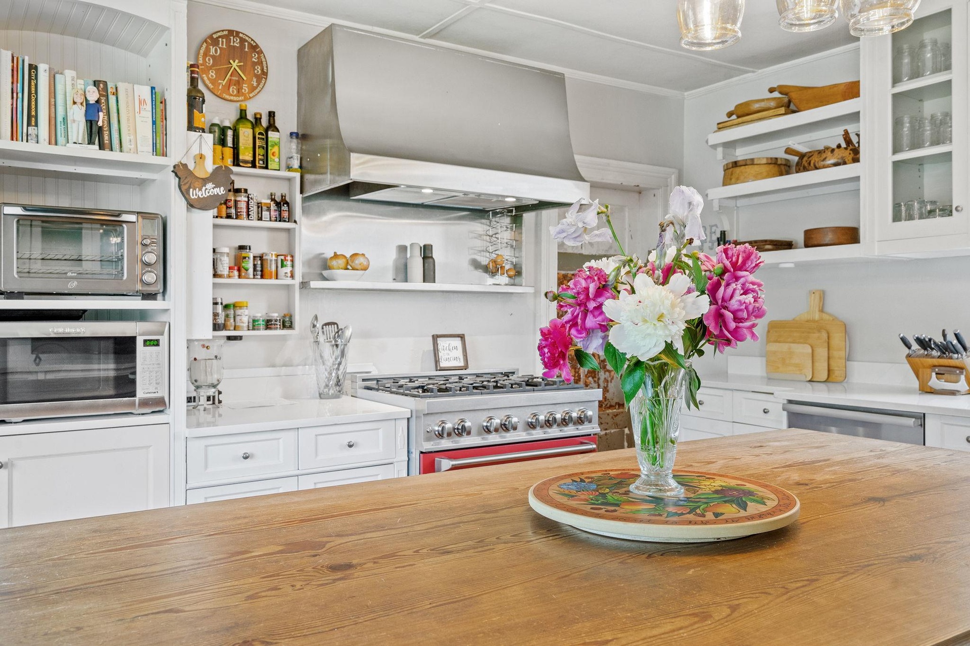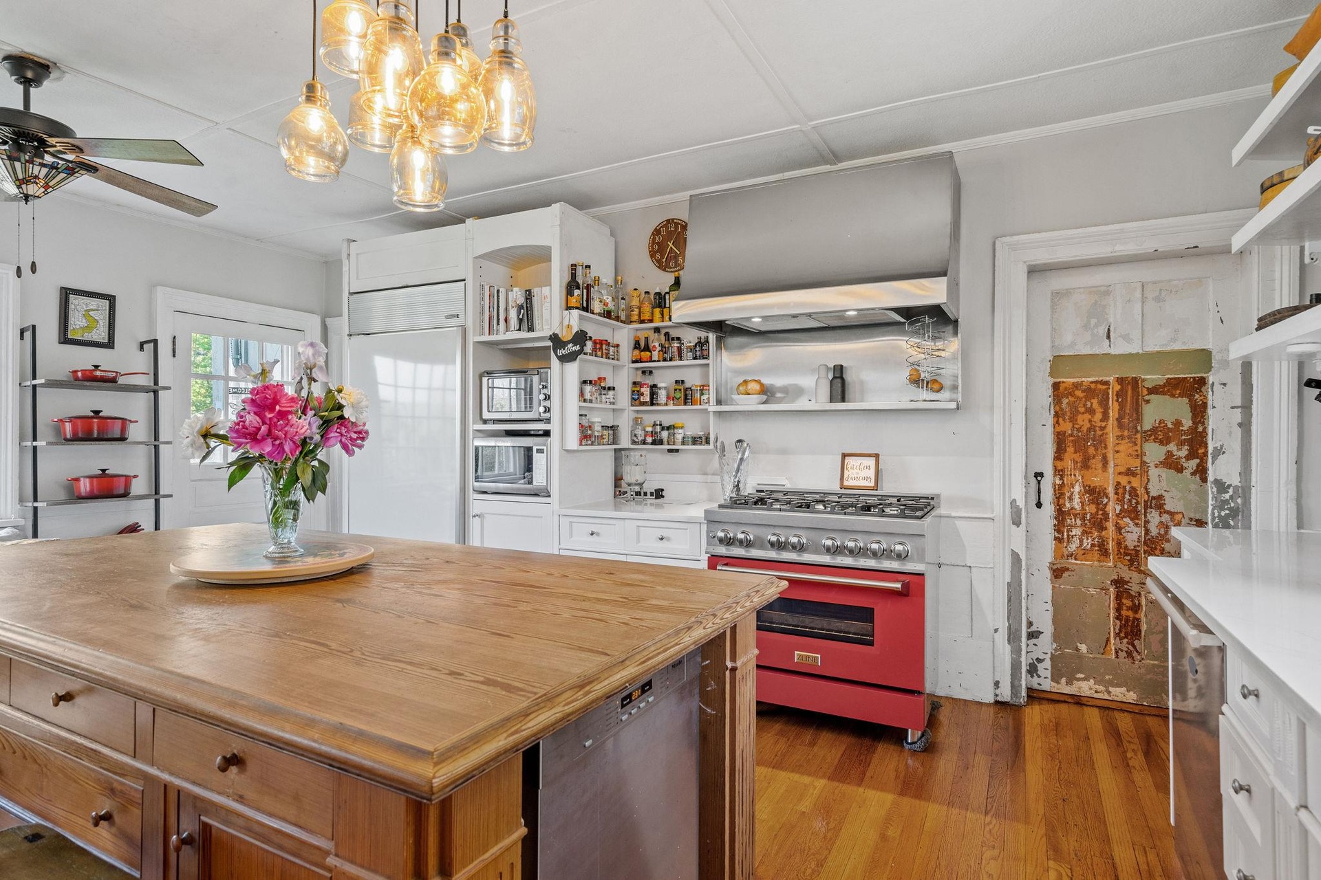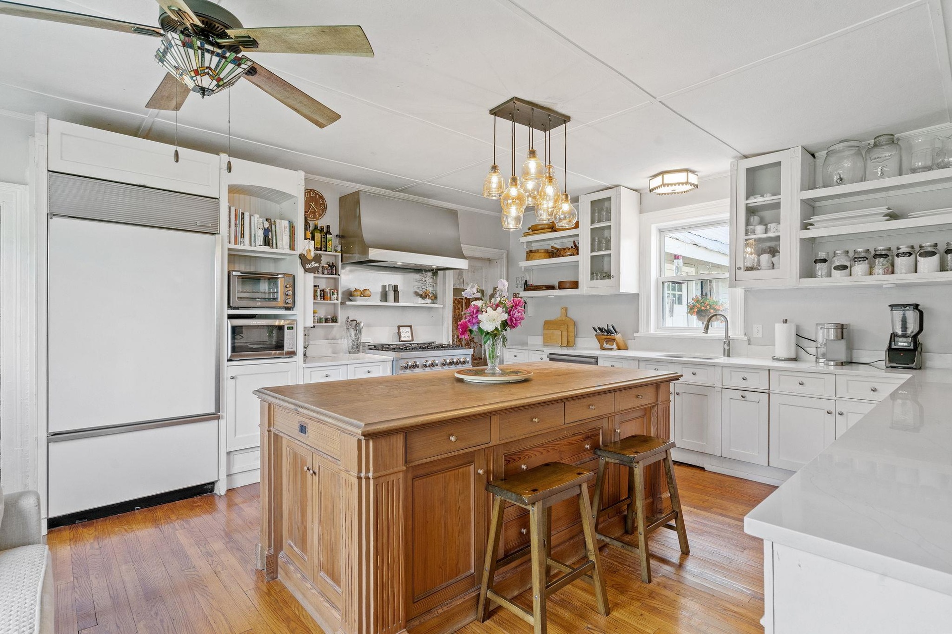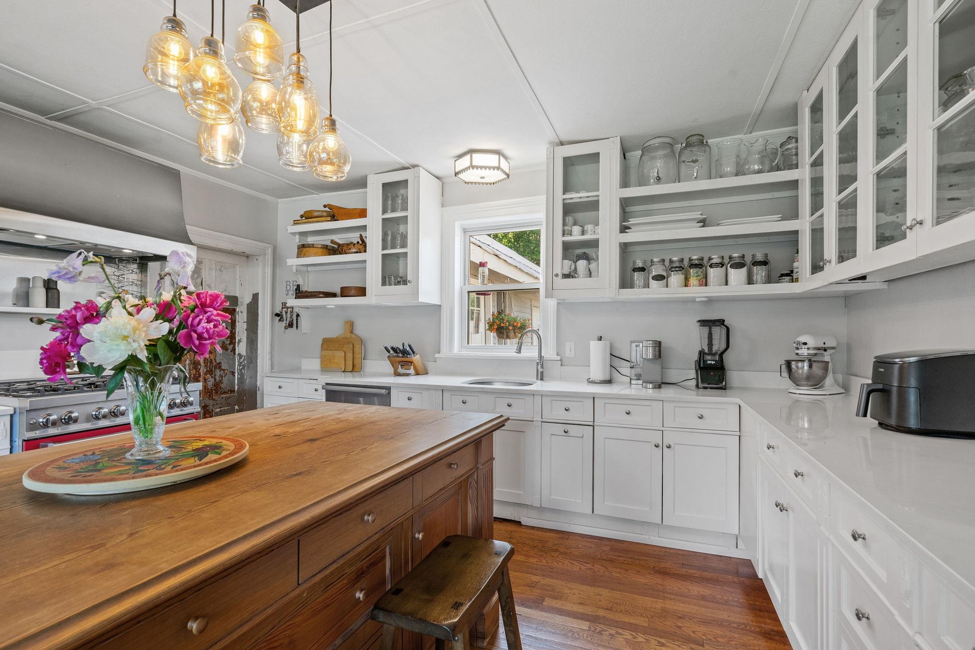 - Kitchen with open shelves, white cabinets, wood counters, pendant lighting, and dark wood finished floors