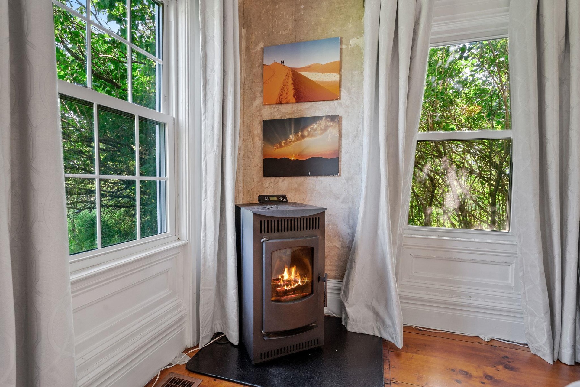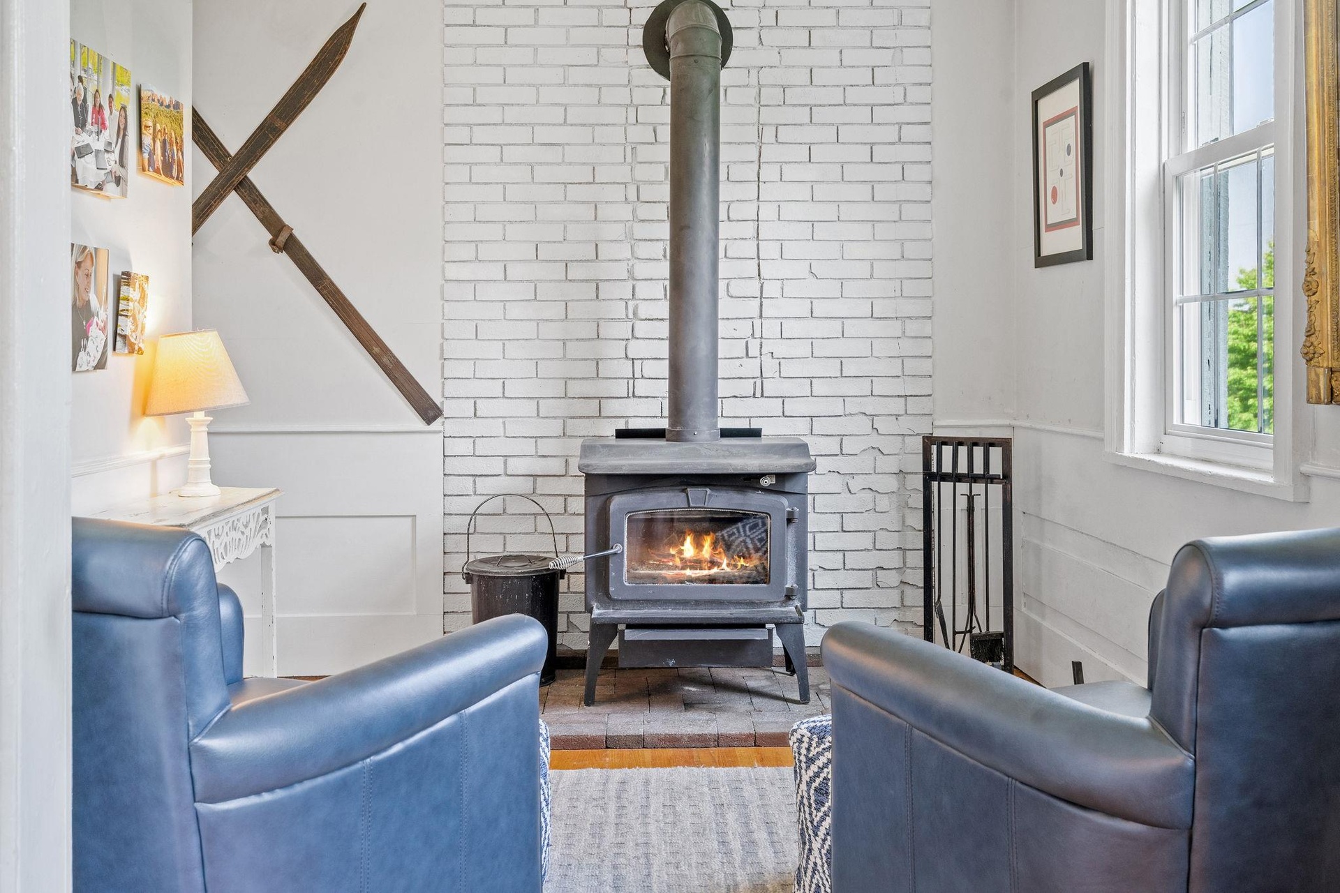 - Detailed view of a wood stove, heating unit, and wood finished floors