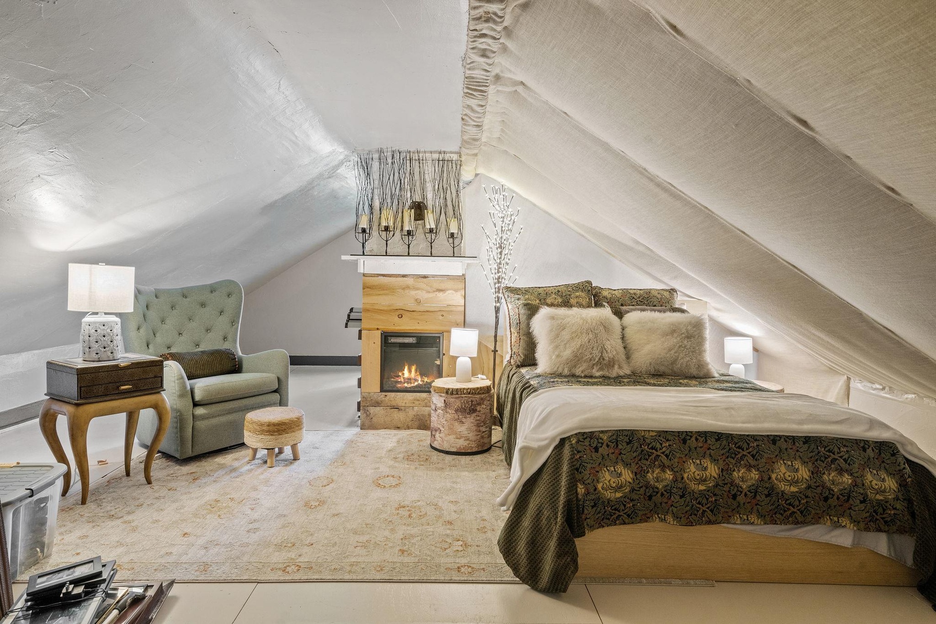- Bedroom featuring lofted ceiling and a glass covered fireplace
