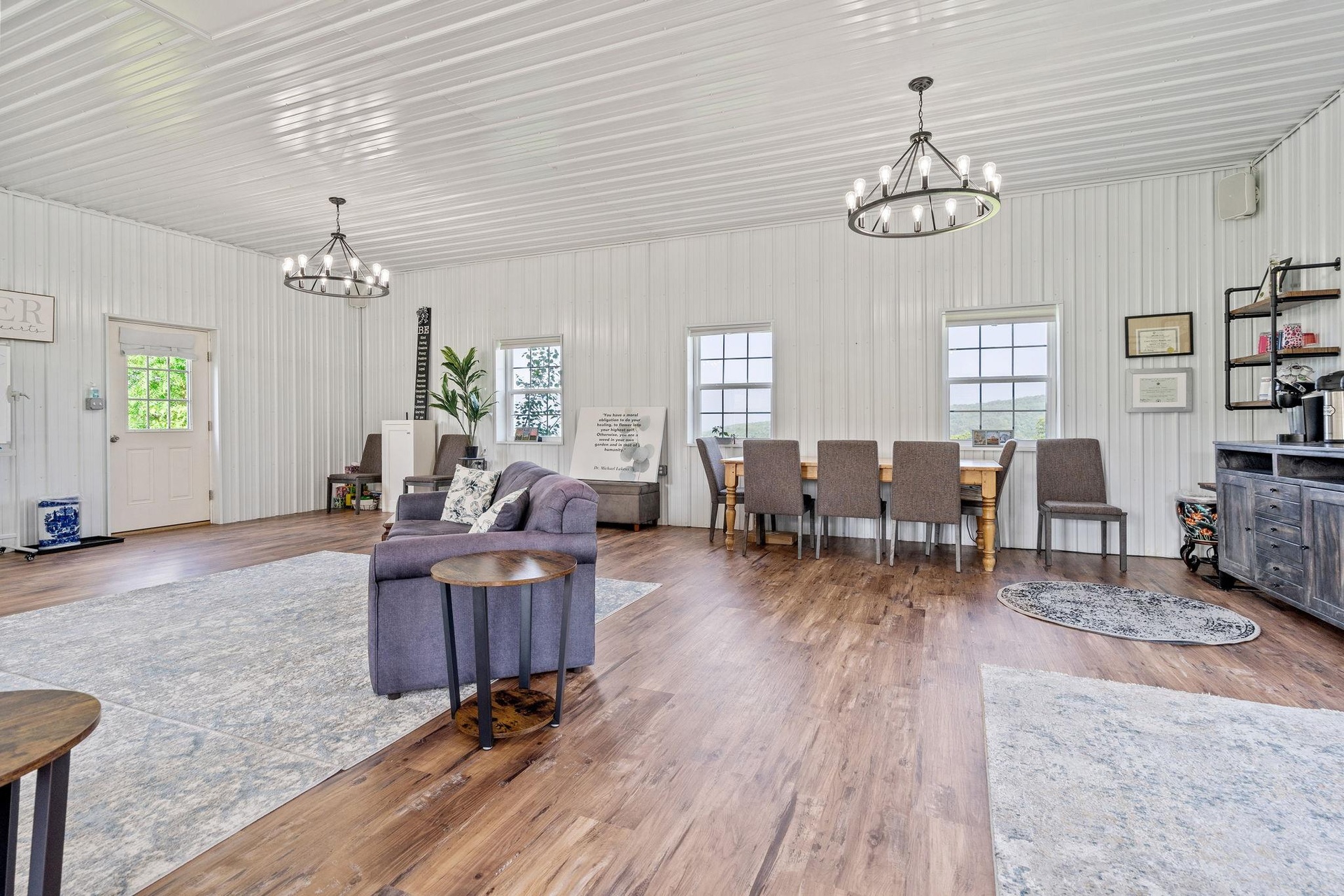 - Living room with a chandelier, plenty of natural light, and wood finished floors