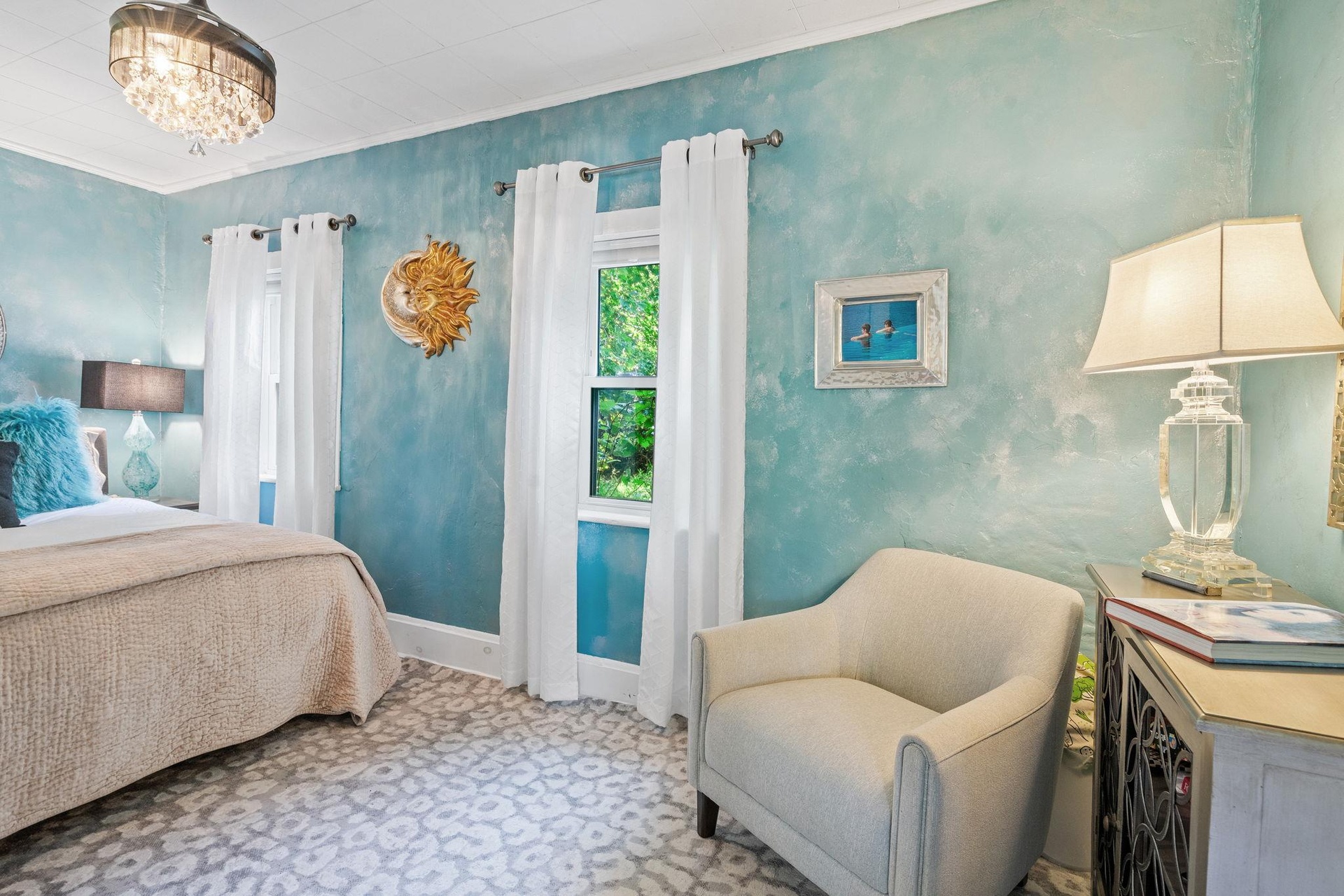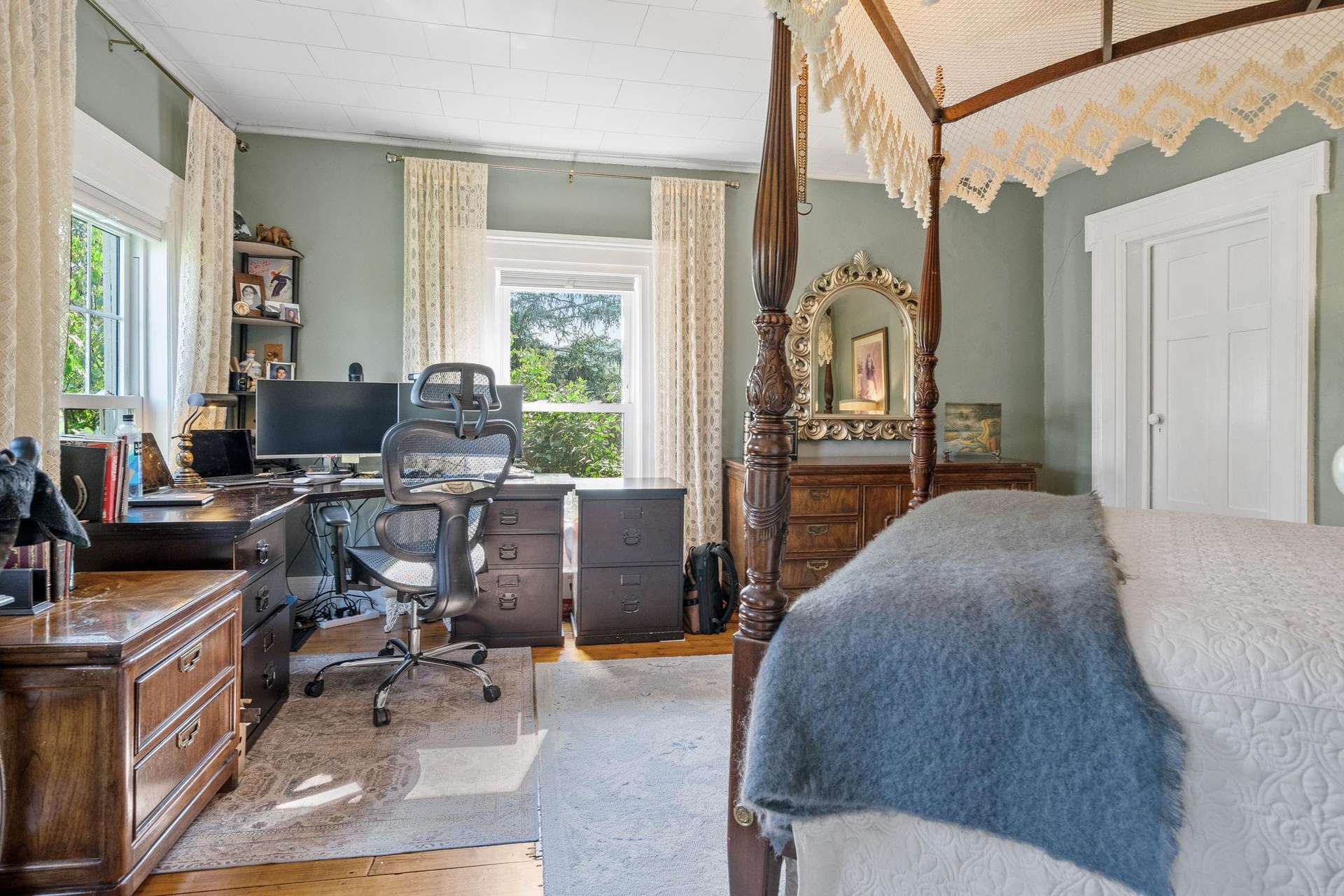 - Bedroom featuring multiple windows, light wood finished floors, and crown molding