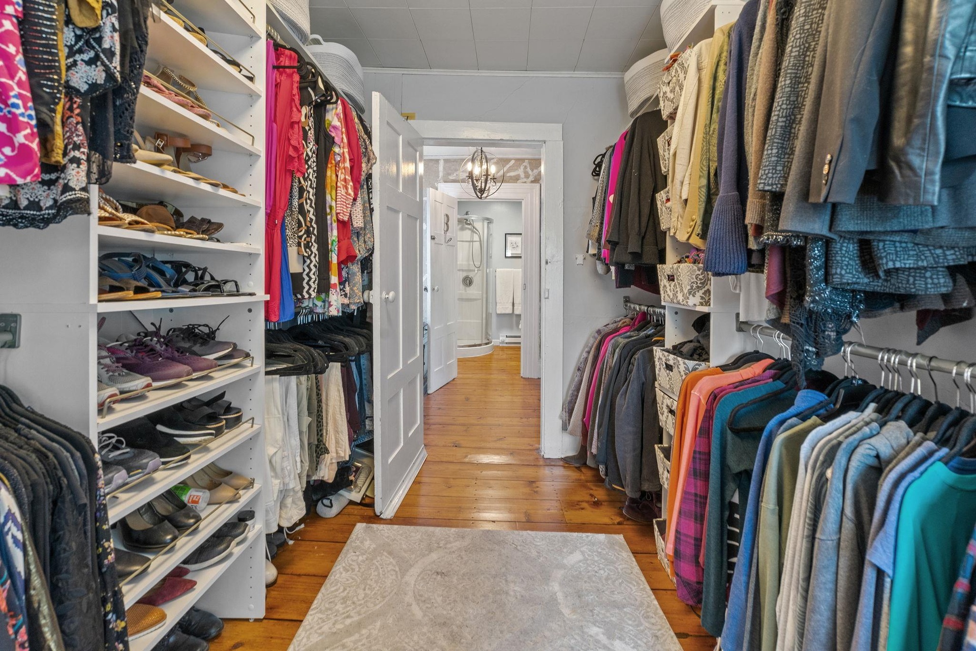 - Hall with a chandelier, hardwood / wood-style flooring, and built in shelves
