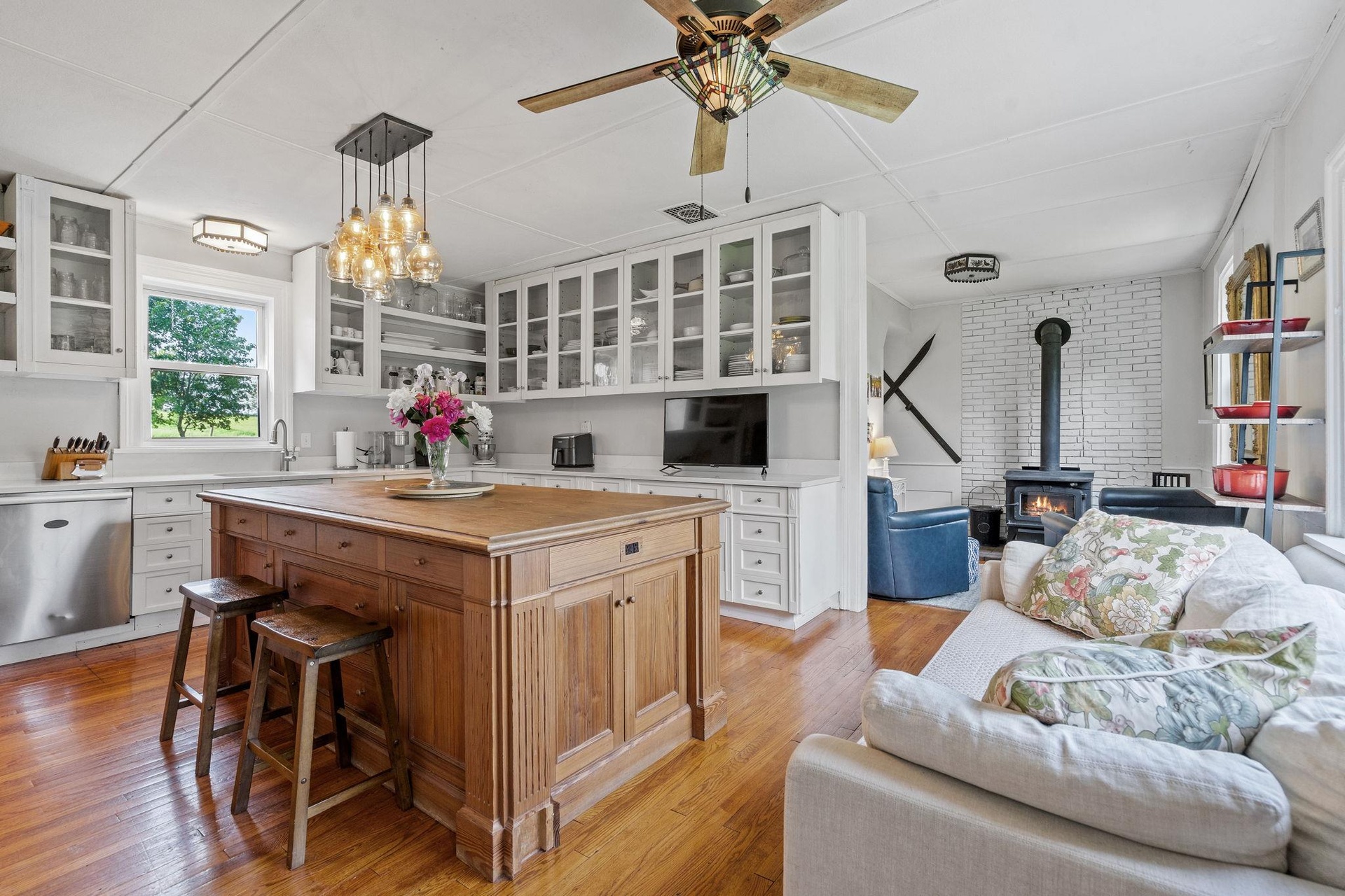 - Kitchen featuring open floor plan, dishwasher, a wood stove, and a ceiling fan