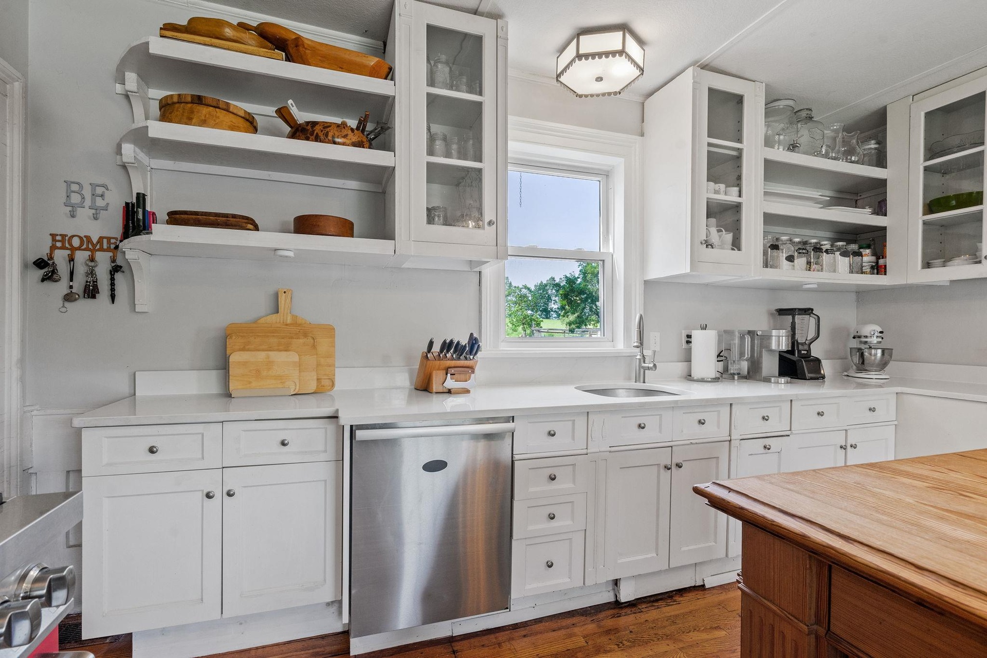 - Kitchen with stainless steel dishwasher, open shelves, and light countertops