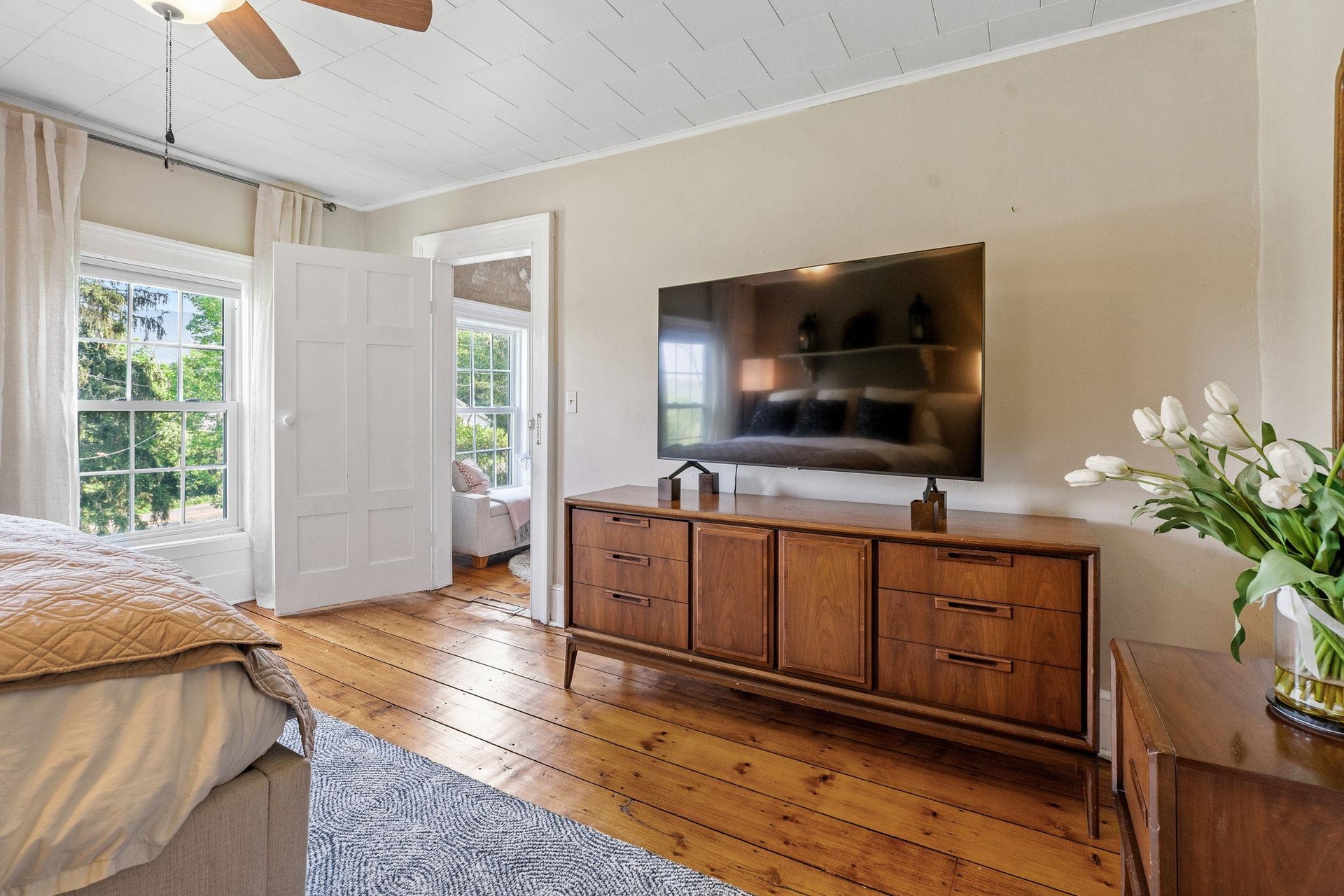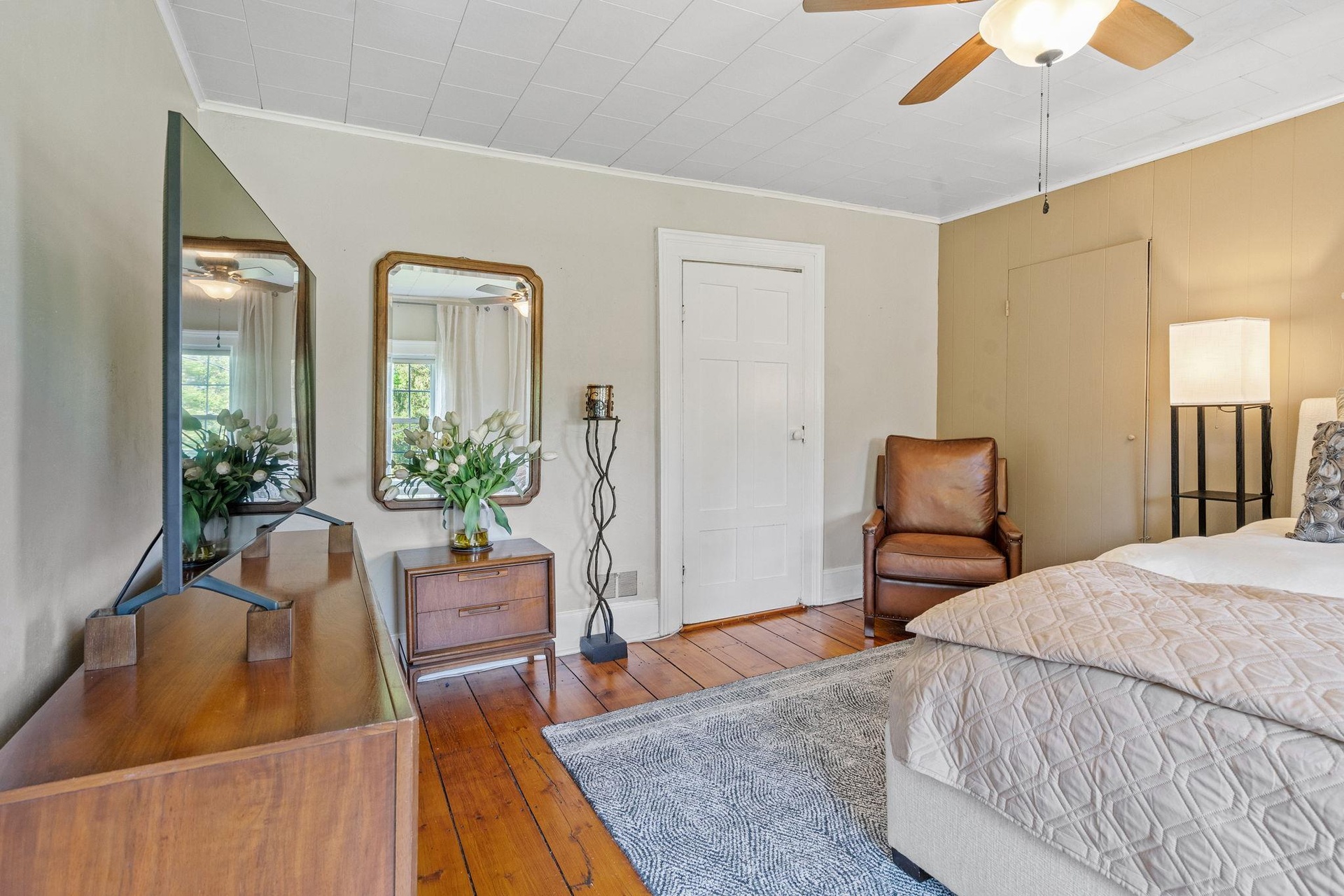 - Bedroom featuring hardwood / wood-style floors, ornamental molding, and a ceiling fan