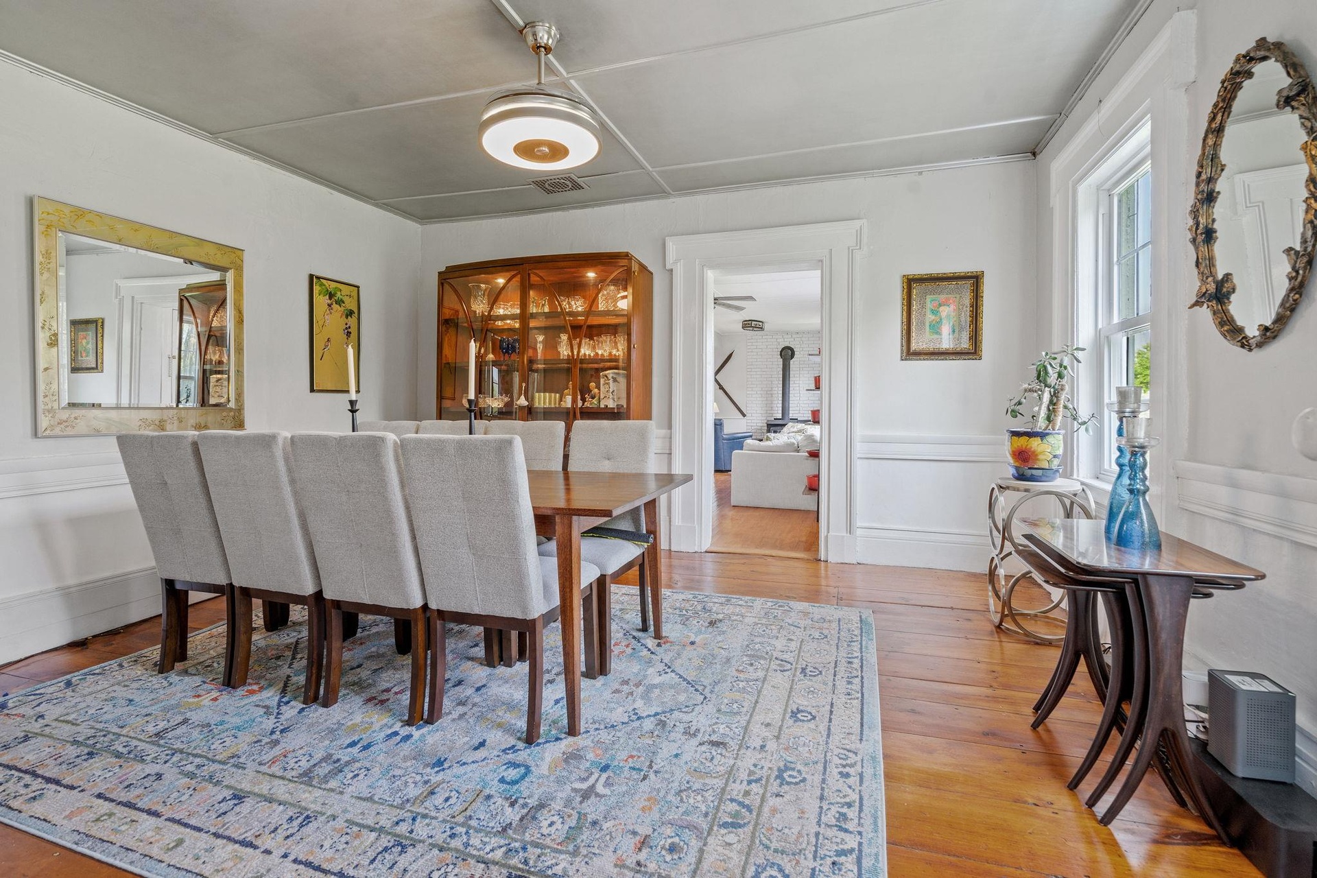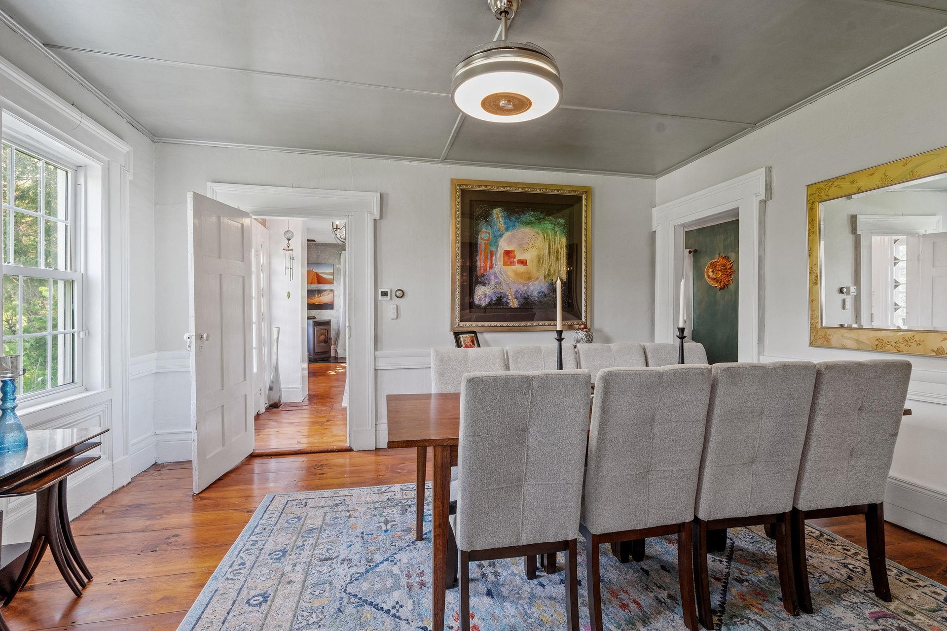 - Dining room with healthy amount of natural light, light wood-style flooring, and wainscoting