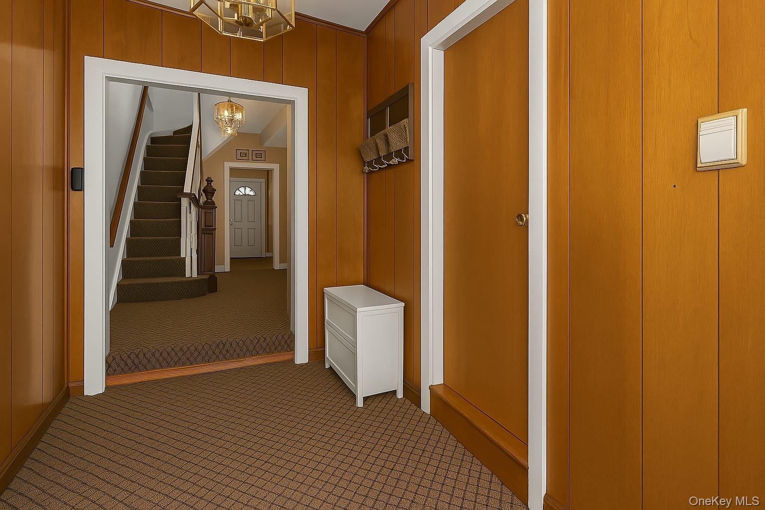 - Hallway featuring a chandelier, stairs, and carpet flooring
