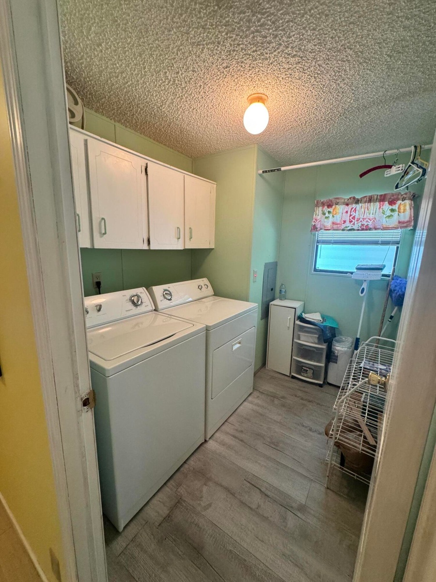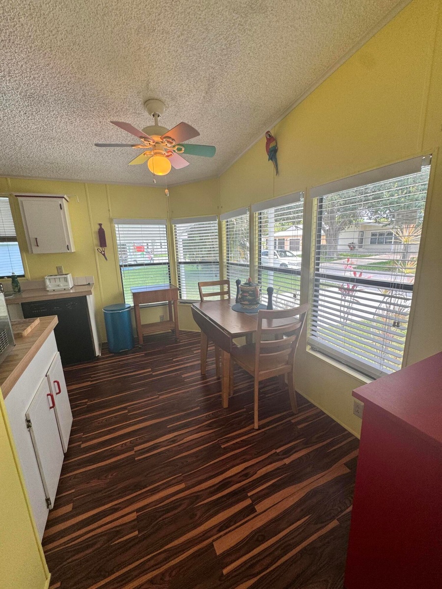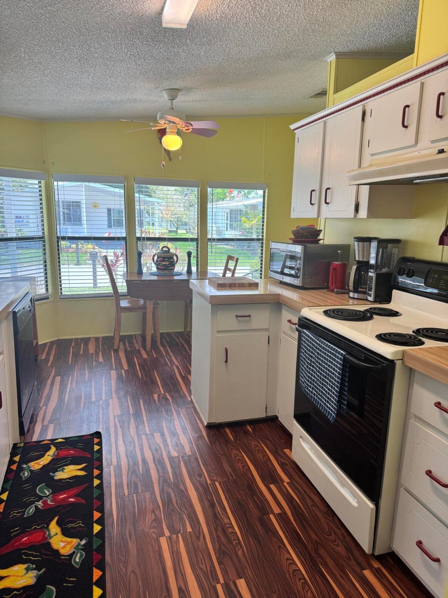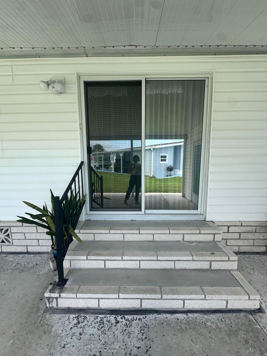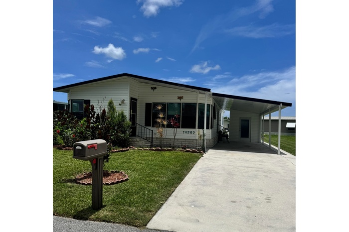 Very well kept 2 bedroom 2 bath home in the desirable 55+Spanish Lakes community. Home has open kitchen with eat in area as well as dining. Double sink in kitchen with kitchen widow over the sink. Home has lots of natural light. Ceiling fans in all rooms. Laminate flooring in main living area. carpet in bedrooms. Large spacious Primary suite with walk in closet. Spacious laundry room is inside home. Built in shelves in dining area for added storage. Large patio off back of home for enjoying the Florida sun. Large green space in backyard with added privacy. Home sits on a very quite street. Lawn care and trash removal included in lot rent. 2 pools, tennis, pickleball, bocceball, shuffle board. club house and much more.