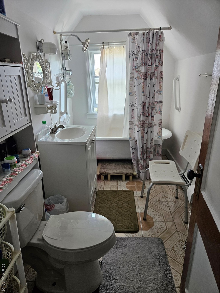 - Full bathroom featuring vanity, shower / tub combo, and lofted ceiling