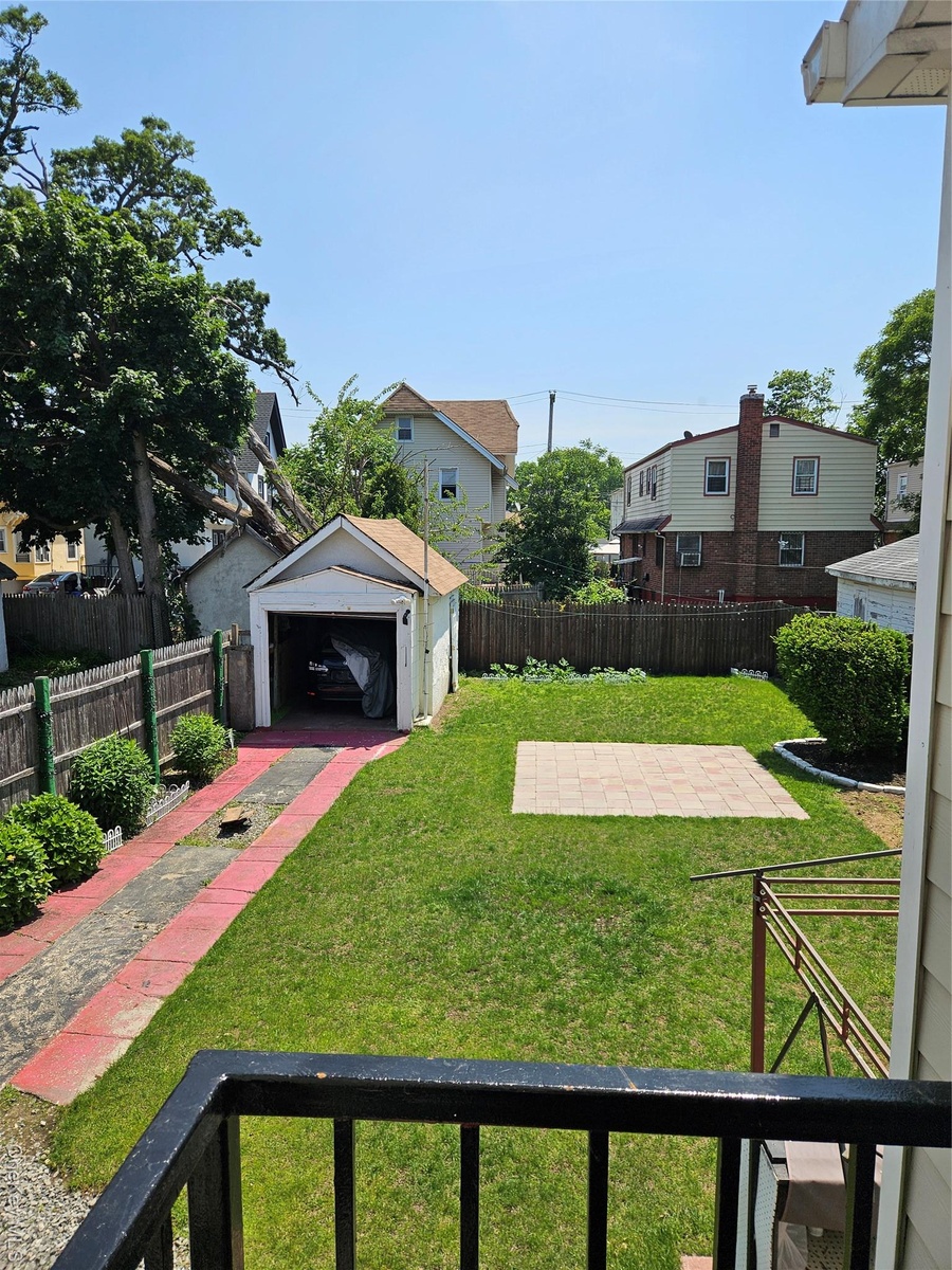 - Fenced yard with a garage, an outdoor structure, driveway, and a residential view