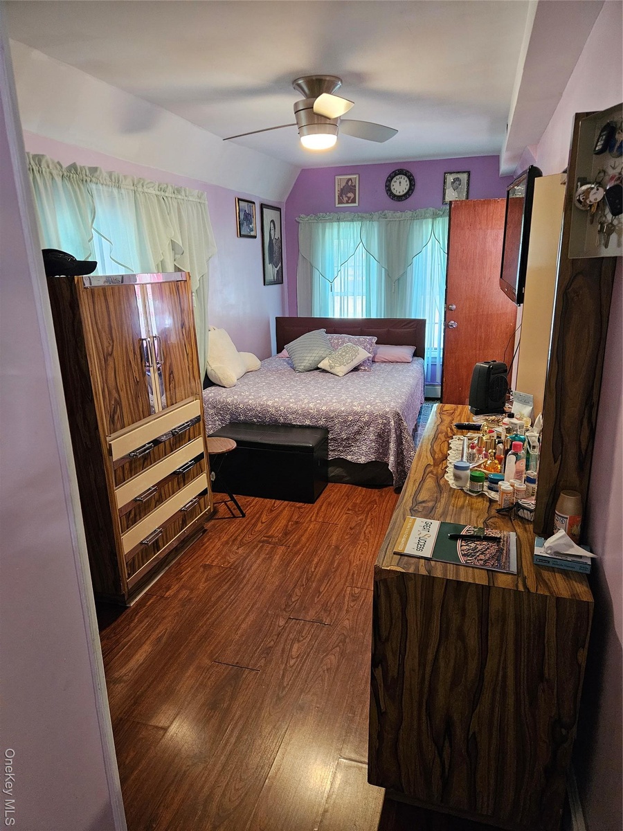- Bedroom with wood finished floors, lofted ceiling, and ceiling fan
