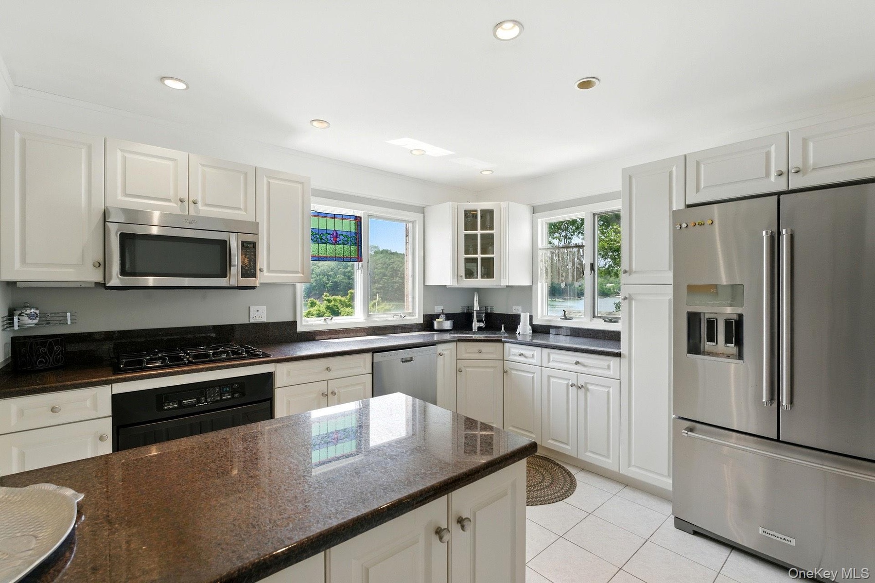 - Kitchen with black appliances, dark countertops, white cabinets, recessed lighting, and light tile patterned flooring