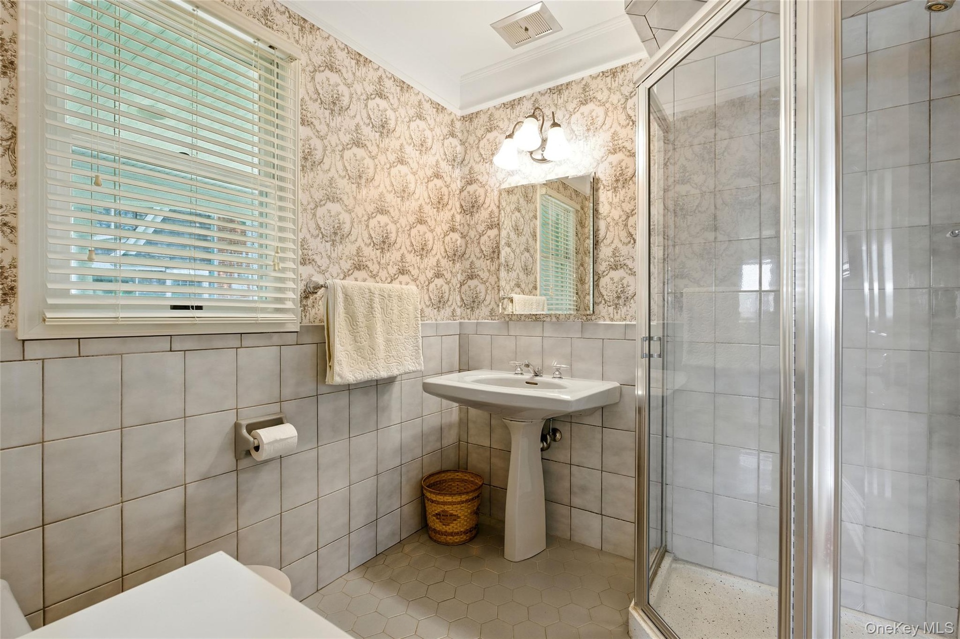 - Full bath with crown molding, a stall shower, wallpapered walls, tile patterned flooring, and tile walls