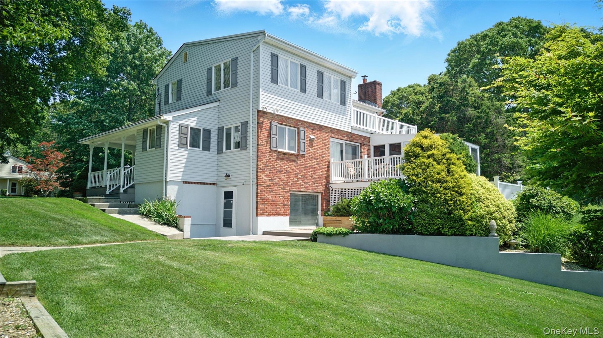 - Rear view of house featuring a lawn, a chimney, a balcony, and brick siding