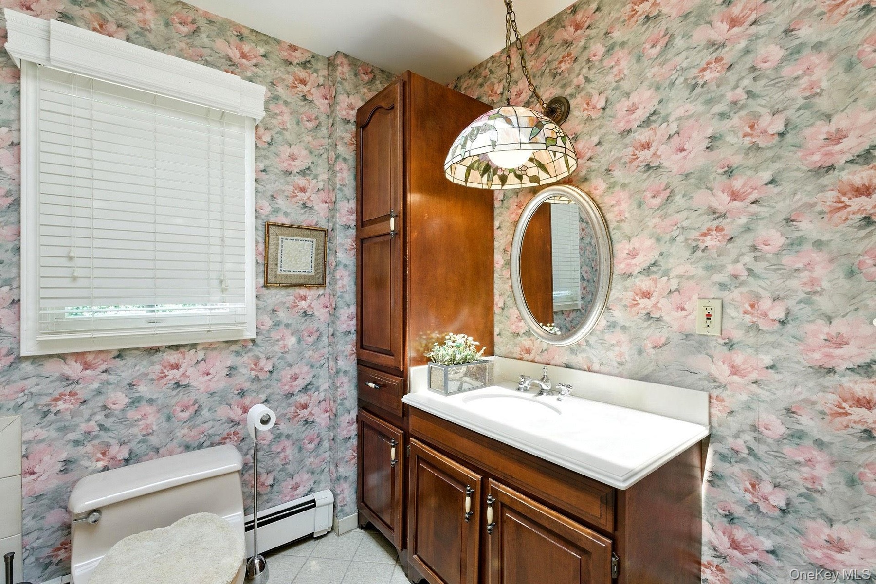 - Bathroom with baseboard heating, tile patterned floors, vanity, and wallpapered walls