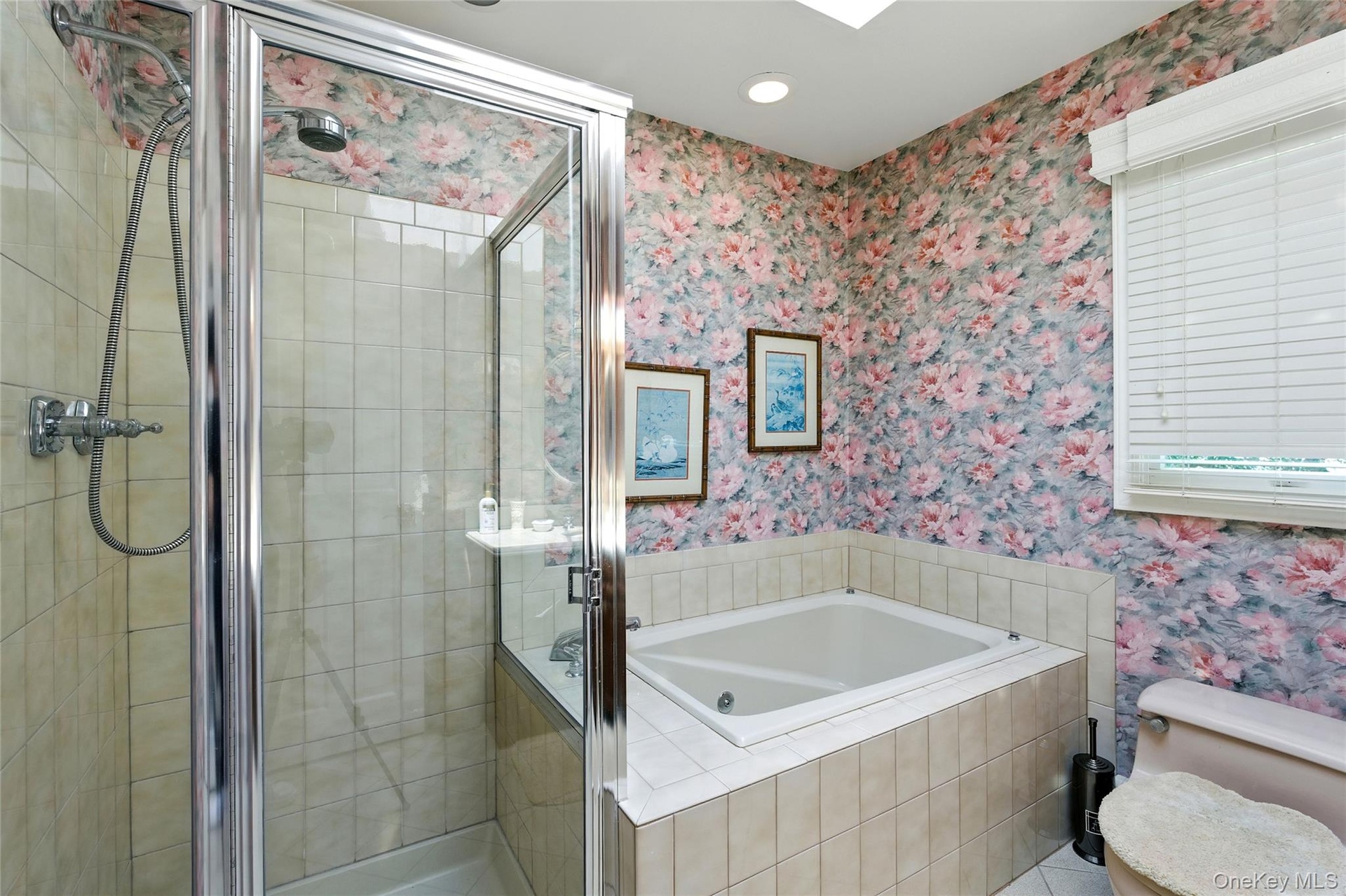 - Bathroom with wallpapered walls, a jetted tub, a shower stall, and recessed lighting