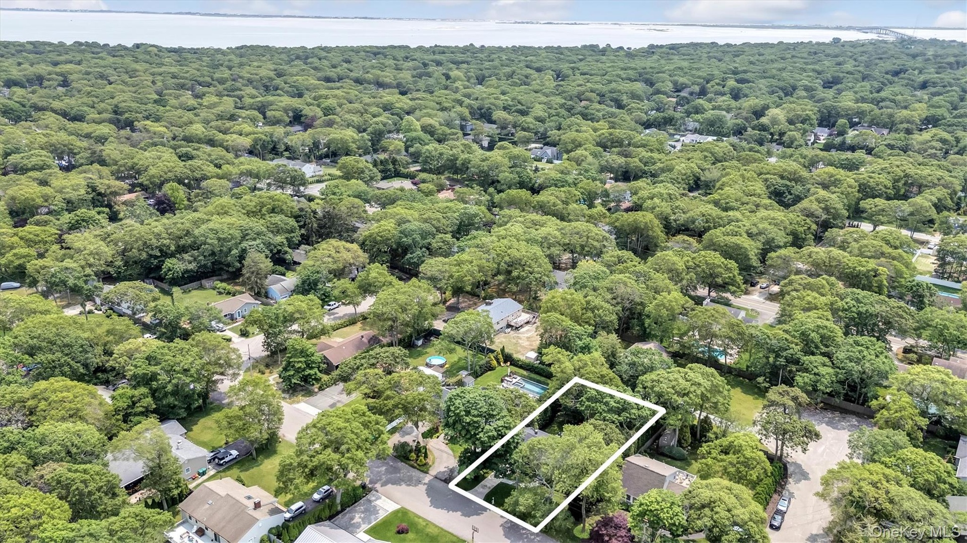 - Aerial view of property and surrounding area with property boundaries highlighted and a nearby Shinnecock Bay