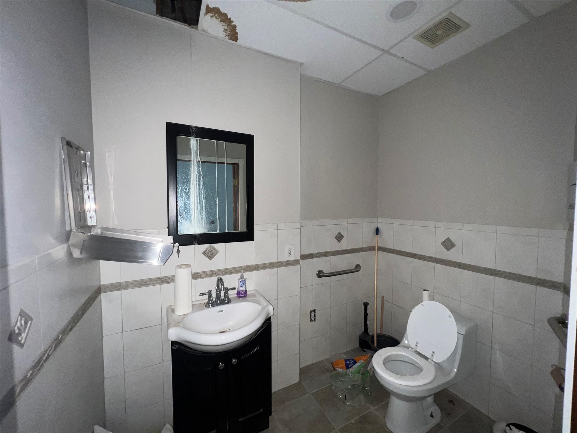 - Bathroom with tile walls, vanity, wainscoting, and tile patterned floors